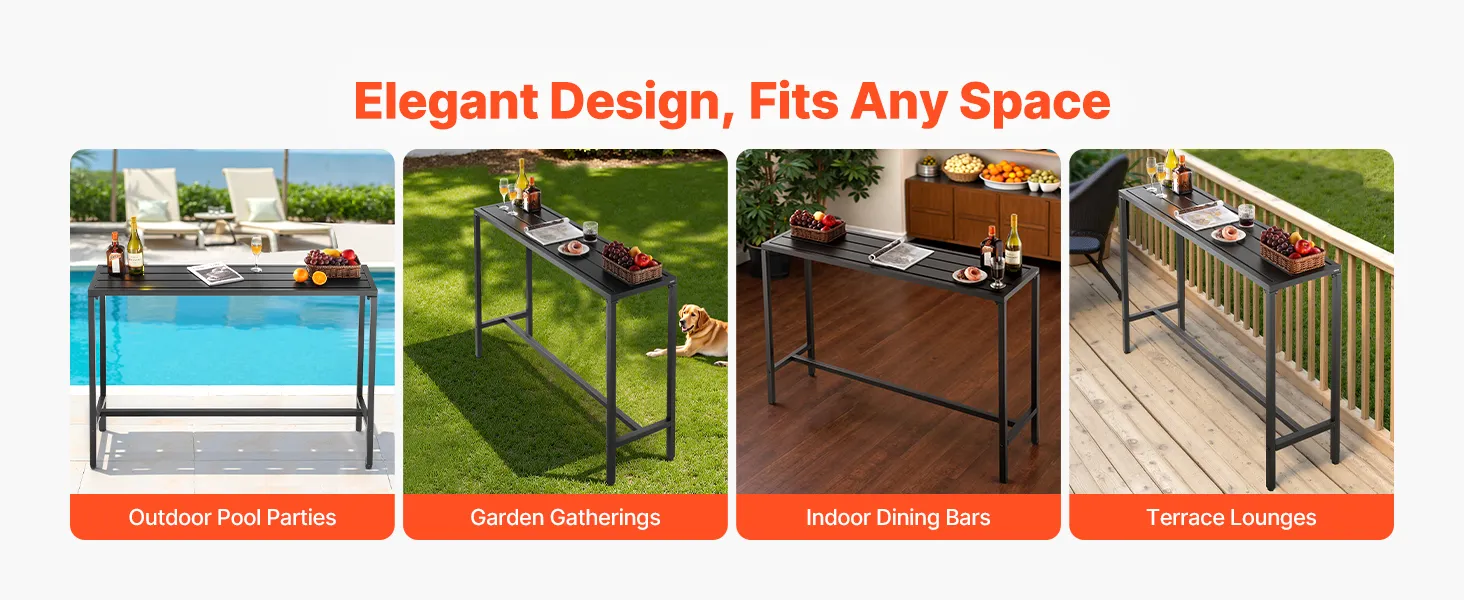 Ideāli piemērots 2–4 cilvēkiem: 100 cm augstais āra bāra galds ir piemērots kompaktām iekštelpām vai āra zonām. Plašā 140 × 37,5 cm virsma ļauj ērti novietot vīna glāzes, augļu šķīvjus un uzkodas 2–4 cilvēkiem, lai kopā pavadītu patīkamus brīžus.
