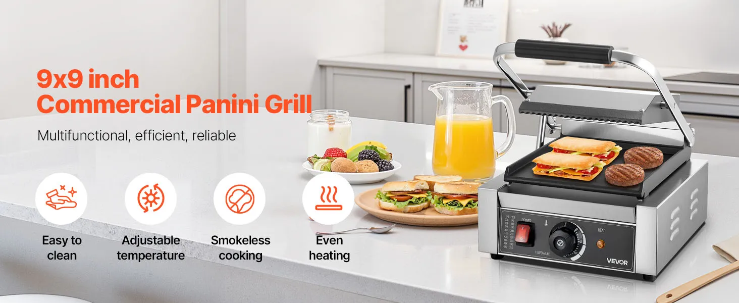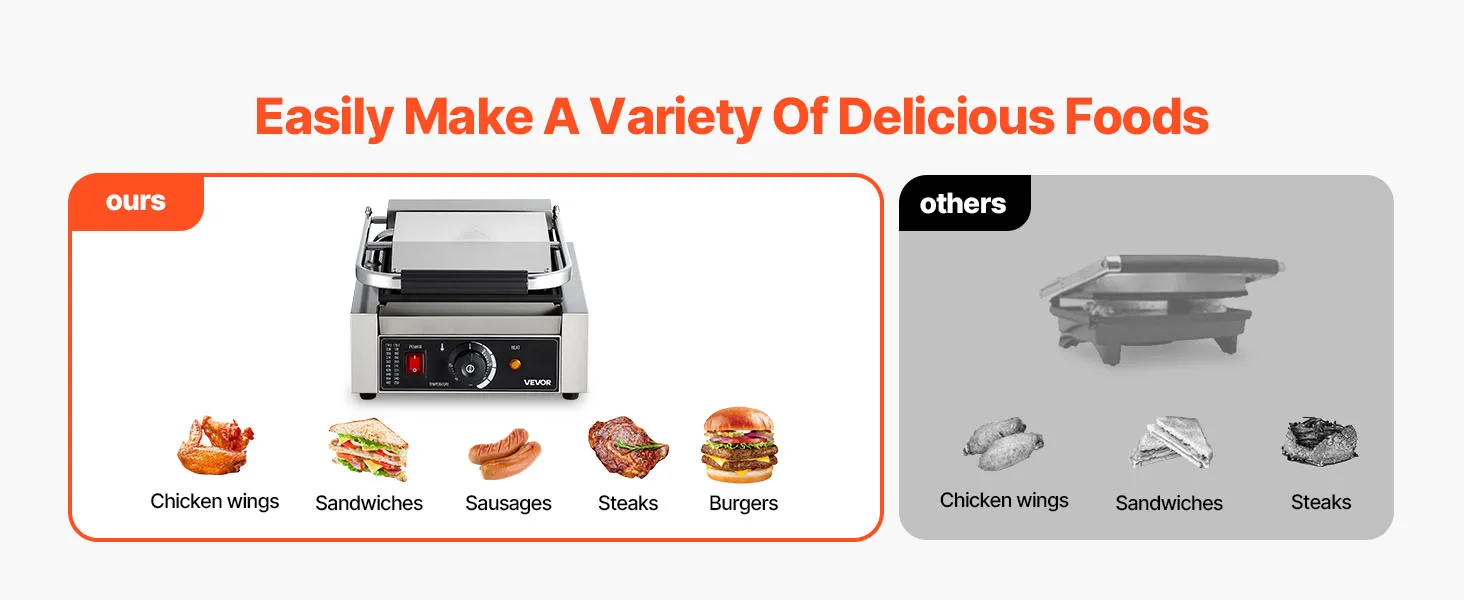 Daudzfunkcionāls grils: šī panini grilēšanas iekārta ļauj vienlaikus gatavot dažādus ēdienus, padarot to ideāli piemērotu dārzeņu, gaļas, siera, olu kultenes, panini sviestmaižu, burgeru, vistas, brokastu ēdienu, steiku un citu produktu pagatavošanai.