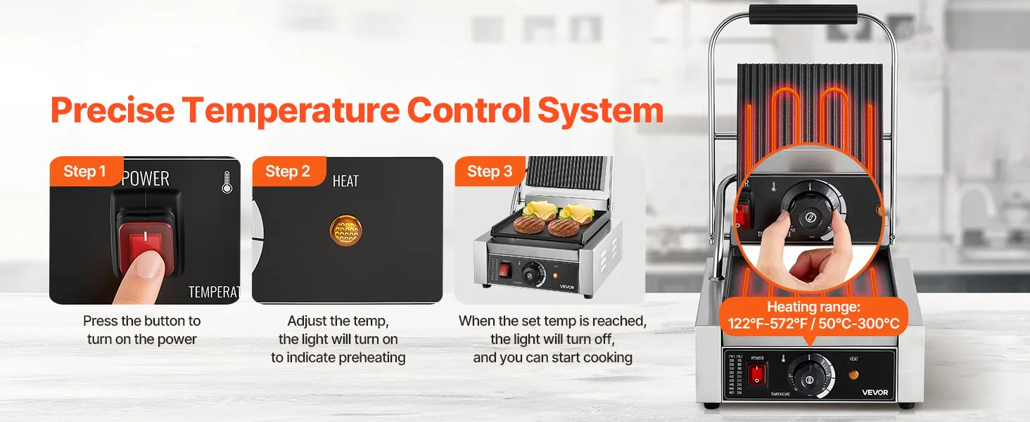 Precīza temperatūras kontrole: sviestmaižu prese ir aprīkota ar temperatūras regulēšanas pogām diapazonā no 50 °C līdz 300 °C. Šis risinājums atbilst dažādu ēdienu gatavošanas prasībām. LED indikators parāda uzsildes statusu.