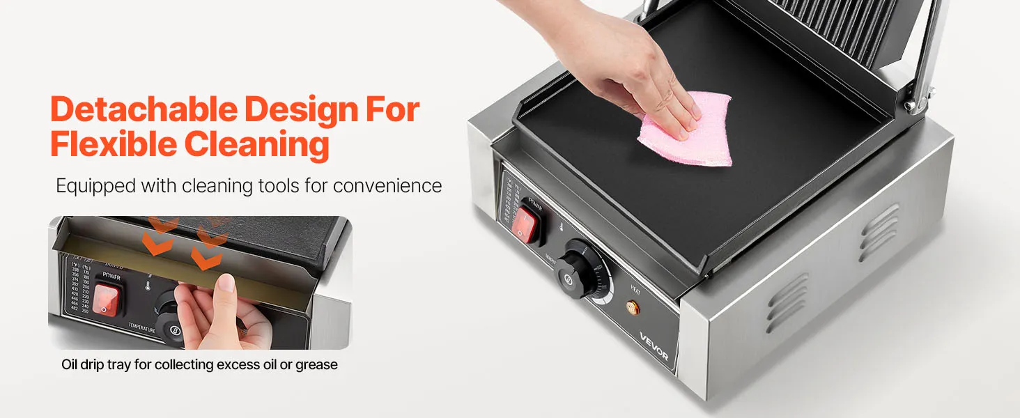 Viegla tīrīšana: panini grils ir aprīkots ar noņemamu eļļas trauku, kas vienkāršo tauku un atkritumu savākšanu. Kopšanu atvieglo skrāpis un sausa drāna. Abās pusēs izvietotās ventilācijas atveres efektīvi izkliedē siltumu.