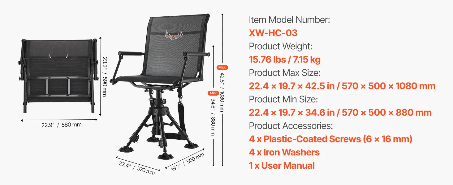 Šim ergonomiskajam medību krēslam ir plašs sēdeklis ar maksimālo izmēru 570 × 500 × 1080 mm (minimums 880 mm). Izturīgā konstrukcija atbalsta līdz 158 kg slodzi un ir uzticama lietošanai ārā.