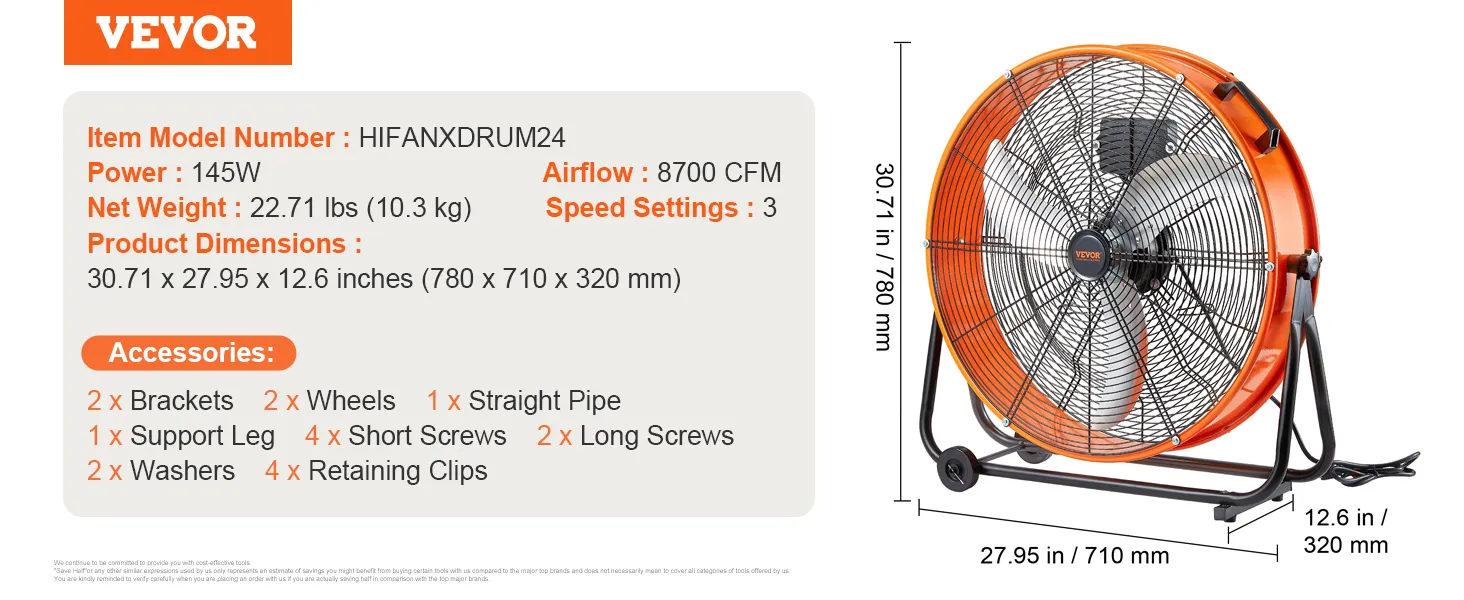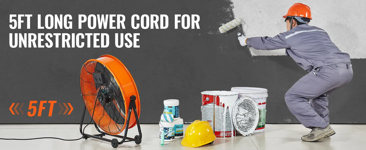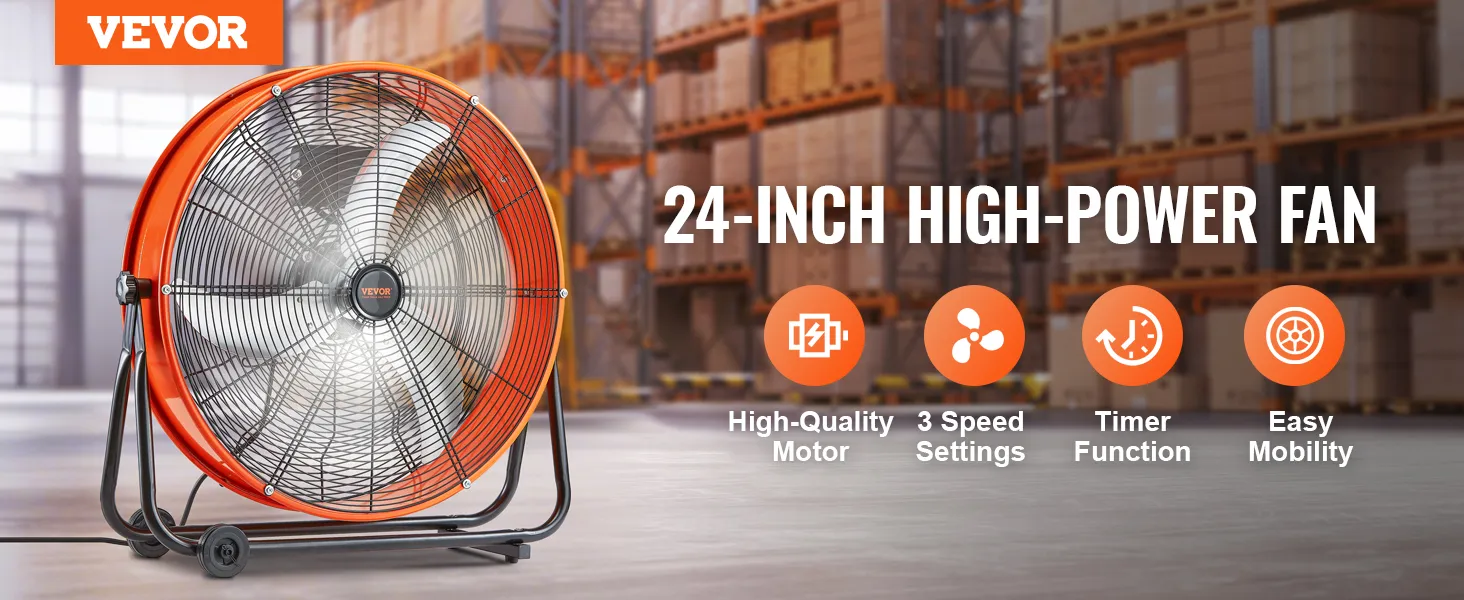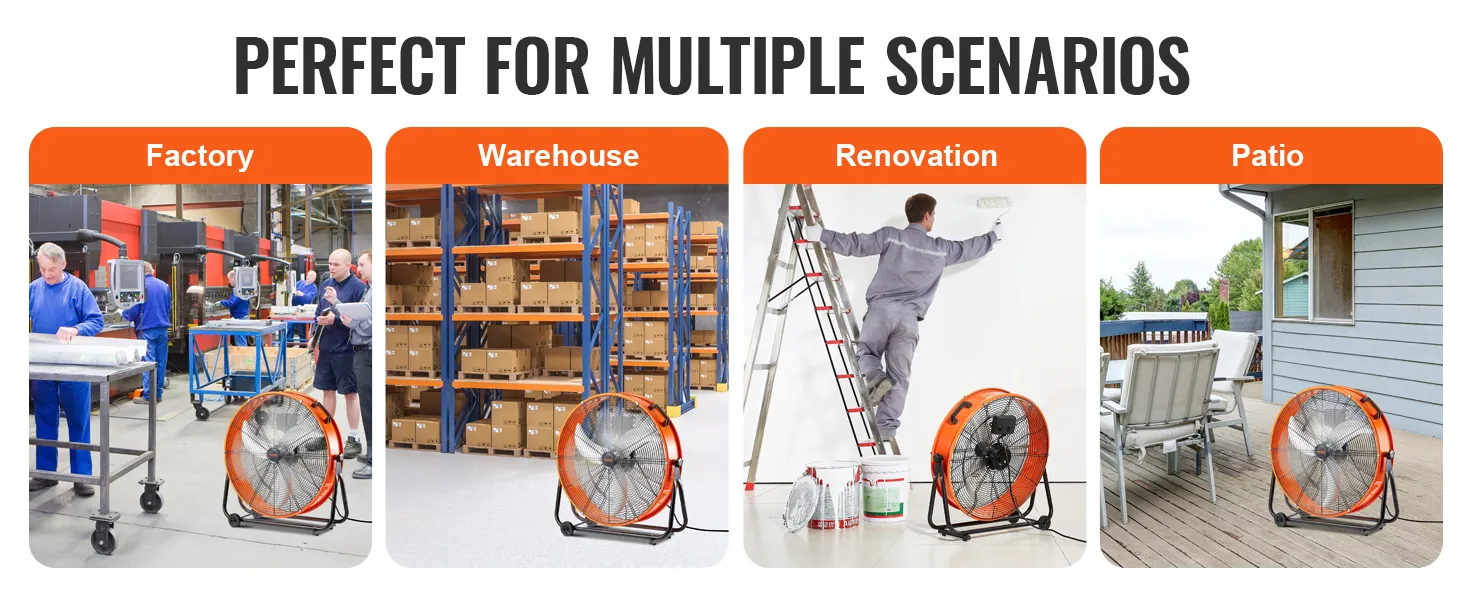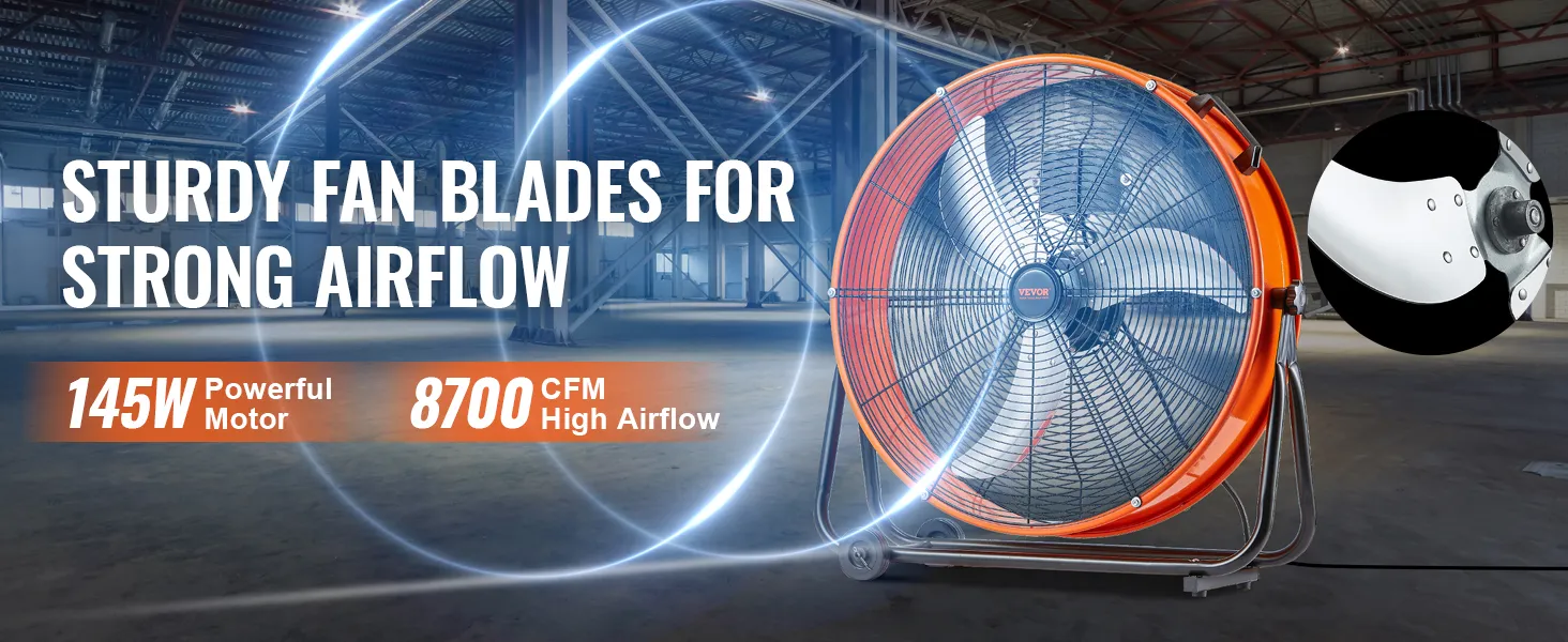 3 ātruma iestatījumi: Ar trim ātruma režīmiem un maksimālo gaisa plūsmu 14 780 m³/h šis rūpnieciskais grīdas ventilators viegli tiek galā ar putekļu izvadīšanu, dzesēšanu un gaisa apmaiņu.