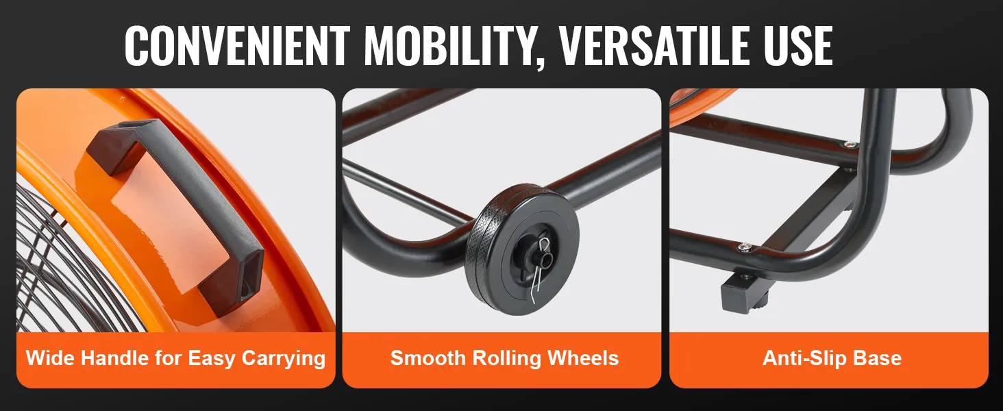 Vienkārša pārvietošana: Pateicoties platai rokturim ērtai pārnēsāšanai ar vienu roku, šo ventilatoru ir viegli pārvietot. Gludi ritošie riteņi ļauj to bez piepūles pārvietot pa gludām virsmām vai nelīdzenu reljefu, nodrošinot, ka jūsu ventilācijas vajadzības vienmēr ir pieejamas.