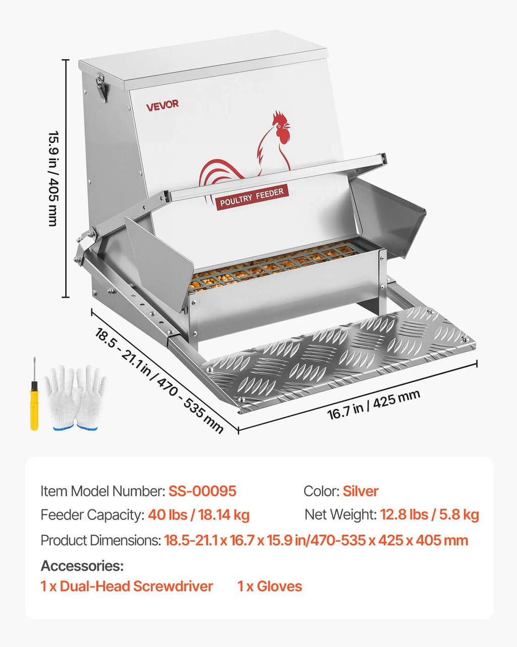 Šī metāla automātiskā vistu barotava atveras, kad mājputni, kas sver ≥500 g, uzkāpj uz pedāļa, un aizveras, kad tie noņem kāju. Aizveramais vāks neļauj maziem grauzējiem piekļūt barībai. Skaņas necaurlaidīga josla samazina trokšņus, bet metāla korpuss iztur košļāšanu.