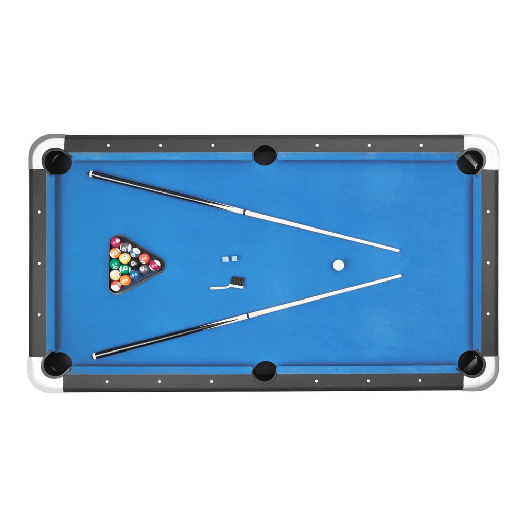 Pilns komplekts: Kijas, bumbas, krīts, birste un trijstūris – viss iekļauts komplektā. Nav trūkstošu detaļu. Atveriet biljarda galdu, atlokiet kājas un sāciet spēli dažu minūšu laikā.