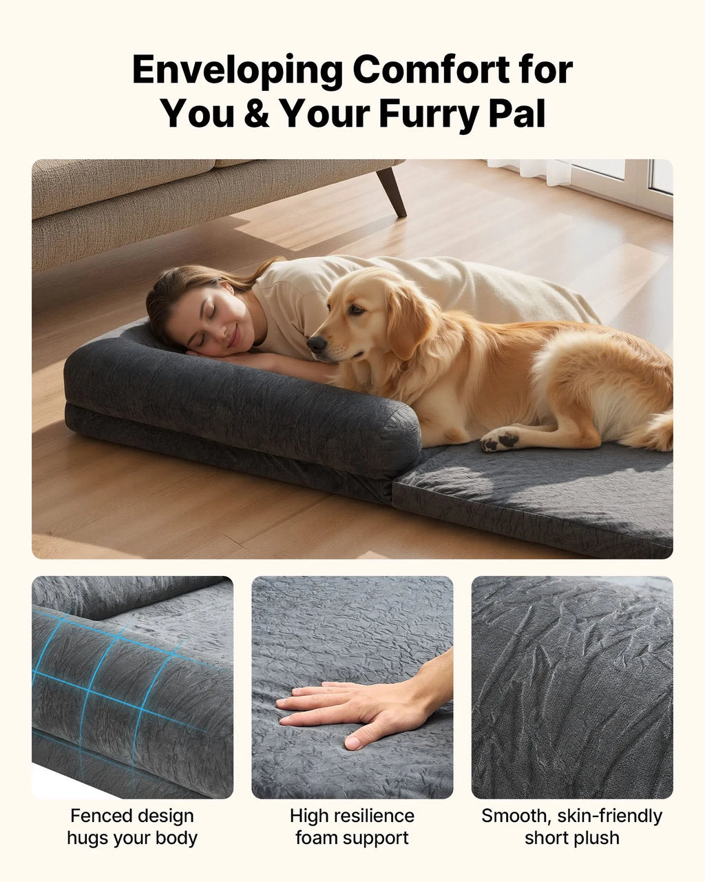 Mājīga koplietošanas telpa: Ar izmēru 1790 × 950 × 240 mm šī cilvēka izmēra mājdzīvnieku gulta pieaugušajiem ir veidota ar taisnstūrveida, daļēji slēgtu dizainu, kas maigi aptver jūs un jūsu četrkājaino draugu. No diendusām līdz filmu vakariem — jūs abi varat baudīt plašu komfortu un mierīgu vietu kopīgai atpūtai.