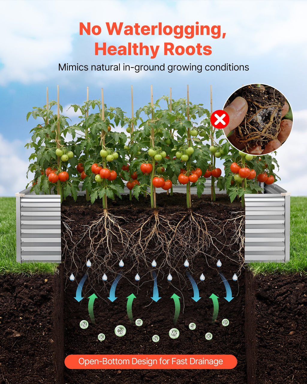 Bez pamatnes konstrukcija ar efektīvu drenāžu: Atvērtā apakša ļauj liekajam ūdenim ātri notecēt, veicinot veselīgu sakņu attīstību un barības vielu uzsūkšanos. Tas samazina kopšanas apjomu arī stipra lietus vai pārliešanas gadījumā.
