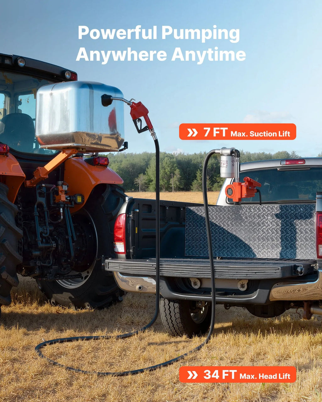 Pilns komplekts darbam: Komplektā ietilpst 4 m izplūdes šļūtene, regulējama 36–94 cm iesūkšanas caurule un barošanas kabelis ar krokodilknaibles tipa spailēm. Viss nepieciešamais ātrai un ērtai degvielas uzpildei darba vietā.