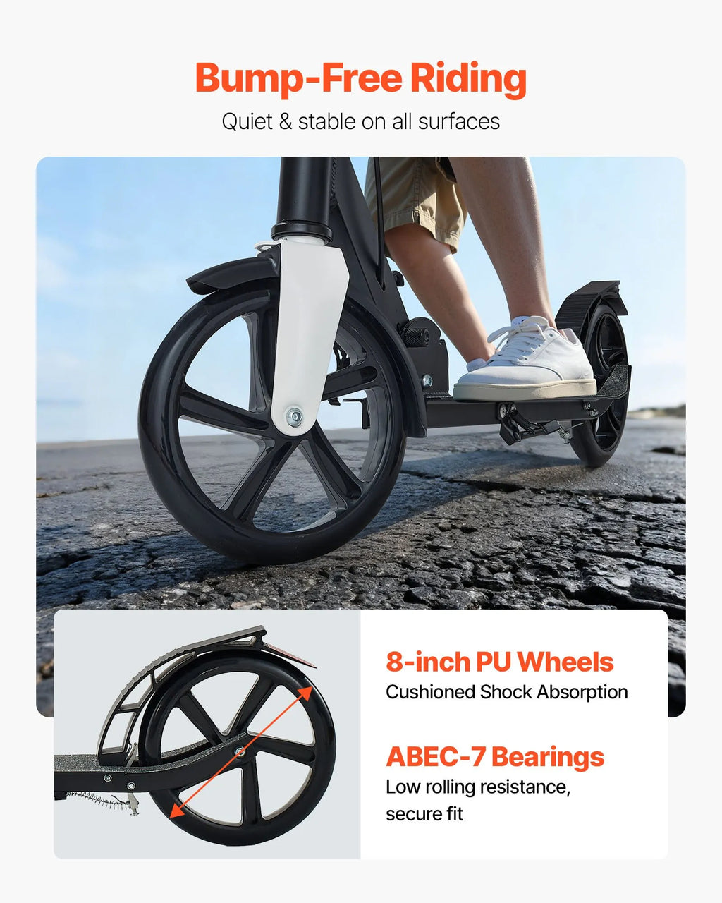 【200 mm amortizējoši riteņi】– Augstas elastības PU riteņi nodrošina vienmērīgu un stabilu braukšanu pa asfaltu, ietvēm, koka un flīžu segumu, samazinot vibrāciju un troksni.