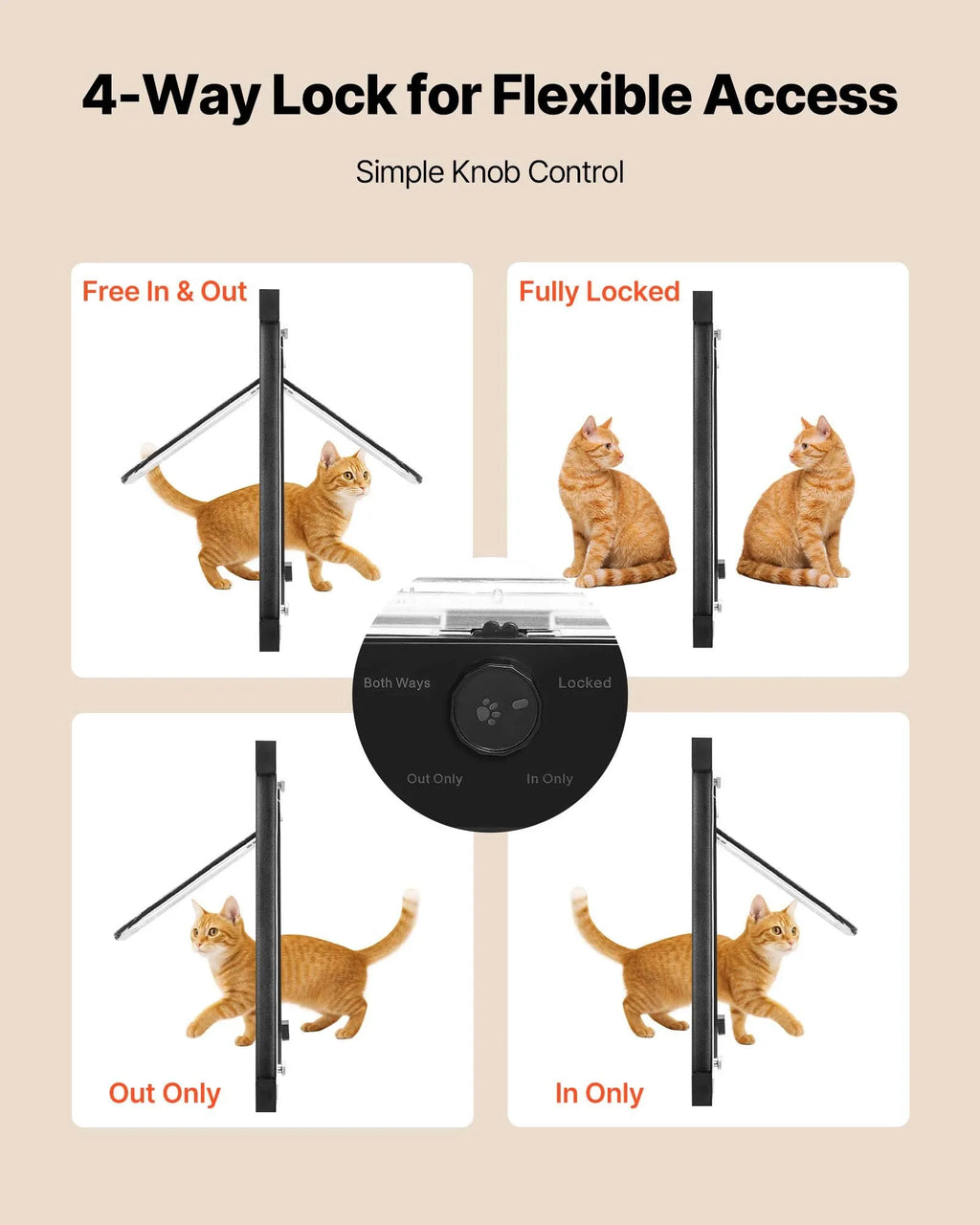 VEVOR kaķu durvis logam, regulējamas loga platumam 787–914 mm, 4 droši bloķēšanas režīmi, alumīnija rāmis un augstas caurspīdības stikls, magnētiska aizvēršana, laikapstākļu izturīgas, ātri uzstādāmas mājdzīvnieku durvis kaķiem, melnas