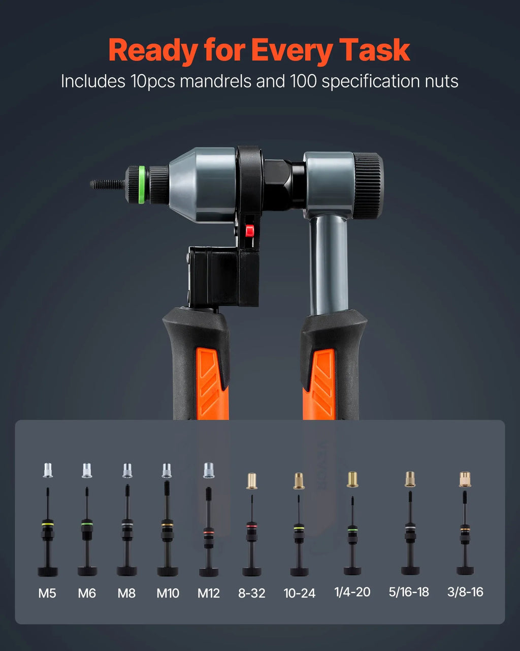 Viens komplekts — vairāk darbu: Šajā kniedējamo uzgriežņu instrumenta komplektā ietilpst 10 maināmas vārpstas (metriskie: M5, M6, M8, M10, M12; SAE: 8-32, 10-24, 1/4-20, 5/16-18, 3/8-16), 100 uzgriežņi (10 gab. katrā izmērā) un pārnēsāšanas koferis ērtai uzglabāšanai un transportēšanai