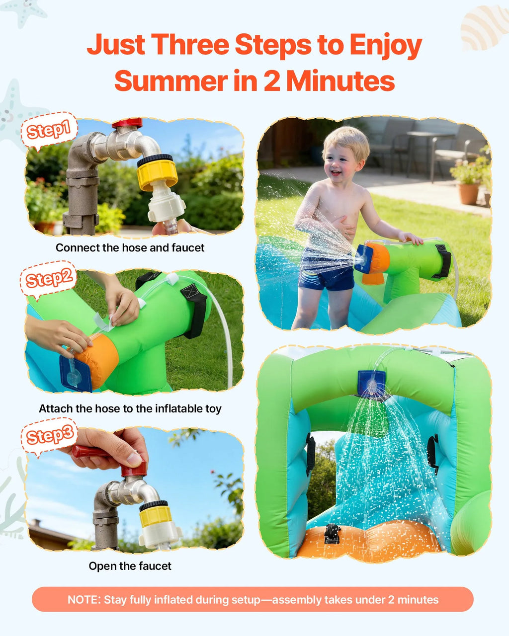 Vairākas rotaļu iespējas: Aprīkots ar plašu lēkāšanas zonu, basketbola grozu un šļakatu baseinu, šis mitrās un sausās lietošanas piepūšamais batuts piedāvā daudzveidīgu izklaidi bērniem un ģimenēm. Ūdens pistole nodrošina nepārtrauktu ūdens strūklu, uzturot slidkalniņu un baseinu gatavu rotaļām un radot aizraujošu piepūšamā ūdens parka pieredzi.