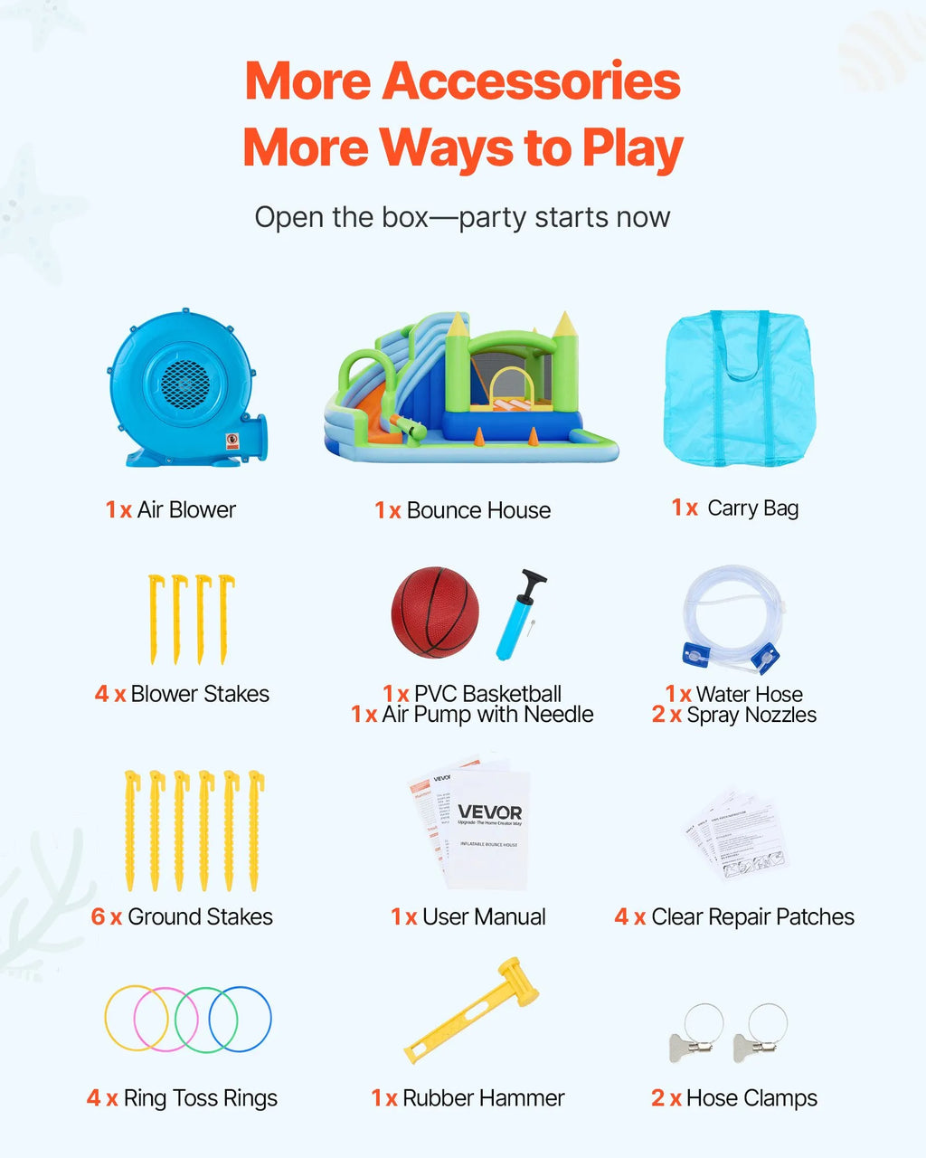 Izturīga konstrukcija: VEVOR piepūšamais ūdens slidkalniņu parks izgatavots no 190T oderes materiāla un bieza 840D + 420D Oxford auduma, kas nodrošina stabilu konstrukciju. Pastiprinātas dubultās šuves uzlabo savienojumu izturību, bet apkārtējais sieta dizains nodrošina ventilāciju un sānu aizsardzību. Iekļauta CPC sertifikācija.