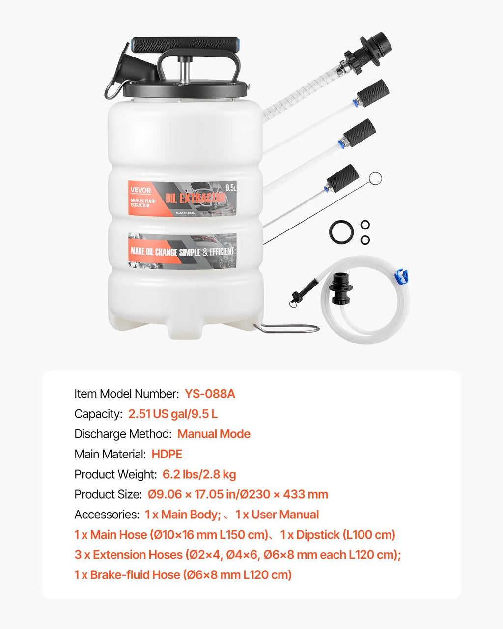 VEVOR šķidruma ekstraktors 9,5 l manuāls vakuuma eļļas maiņas sūknis ar 150 cm šļūteni un trim 120 cm pagarinājuma caurulēm, HDPE tvertne automašīnām, zāles pļāvējiem un laivām