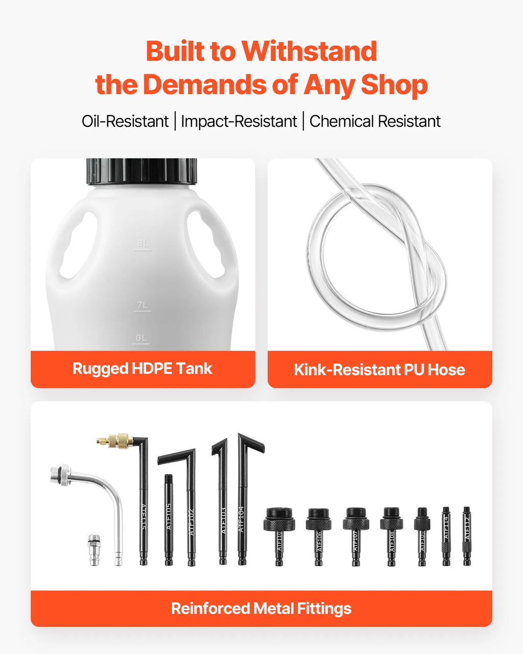 HDPE tvertne ir izturīga pret eļļām un ķīmiskām vielām. Pastiprināti metāla adapteri paredzēti atkārtotai lietošanai, bet elastīgā PU šļūtene nodrošina liekšanos bez salocījumiem, samazinot noplūdes risku.