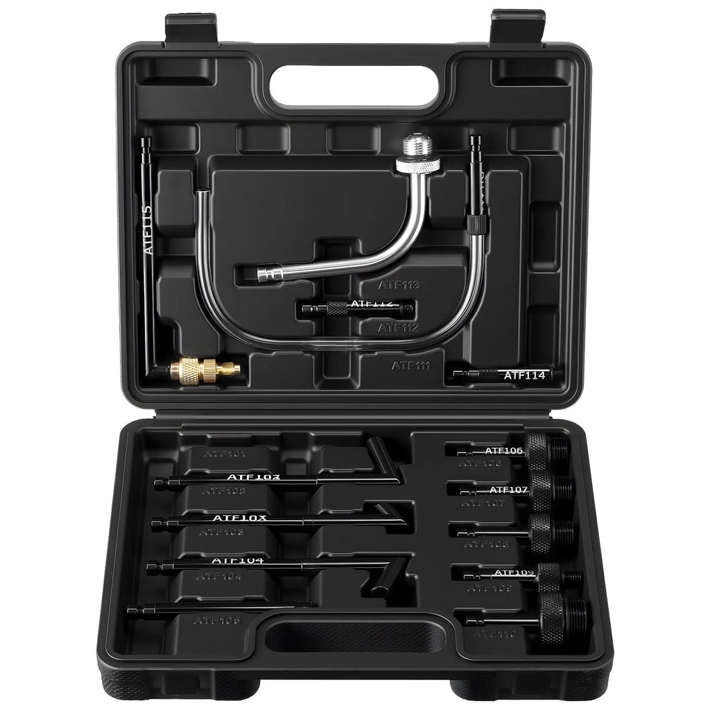 Komplektā 15 metāla ATF uzpildes adapteri (1/8"-27, M10×1,0, M24×1,5 u.c.), kas piemēroti Ford, BMW, VW/Audi, Honda, Nissan un citu ražotāju transportlīdzekļiem.