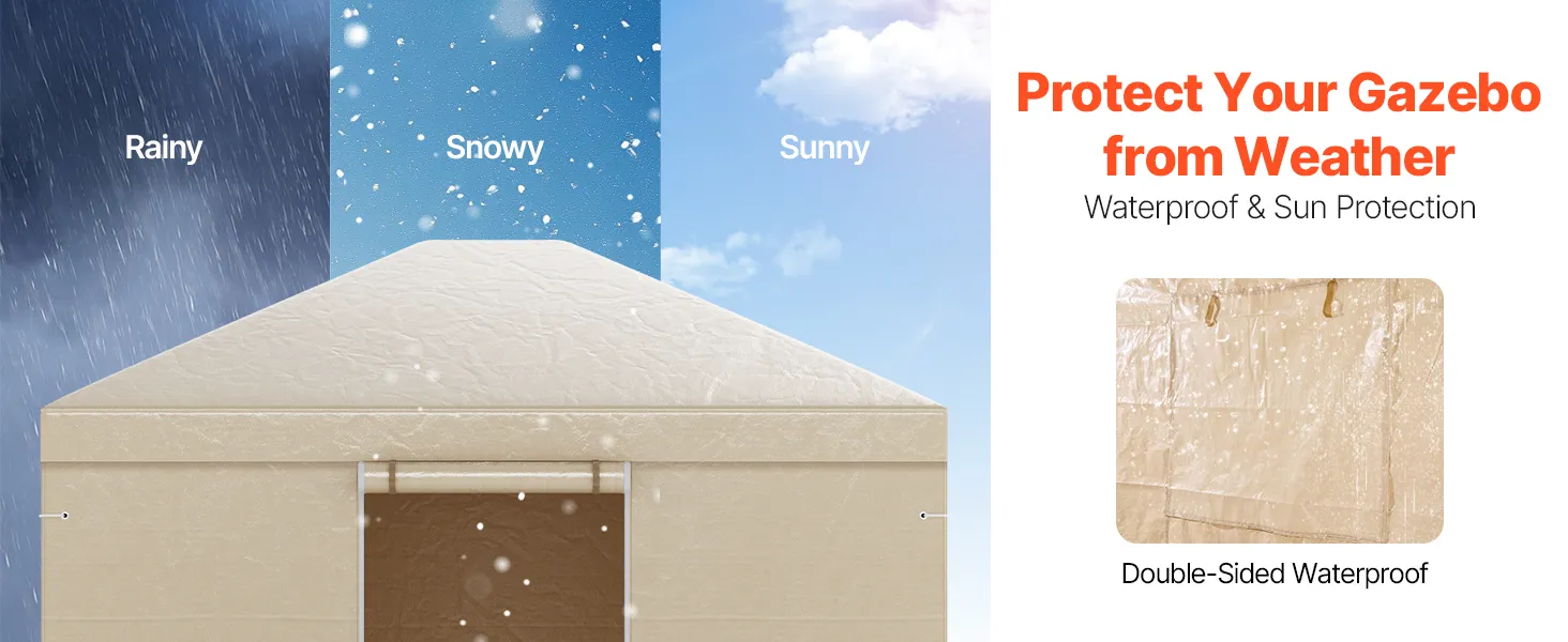 Piemērots 3,07 × 3,67 m paviljoniem: šis ziemas paviljona pārsegs ir paredzēts 3,07 × 3,67 m paviljoniem (paviljons nav iekļauts komplektā). Pārsegam ir jumta pārkares visās četrās pusēs, kas pielāgojas dažādiem augstumiem un slīpumiem, nodrošinot drošu un precīzu piegulšanu. Tas nodrošina pilnīgu pārklājumu, lai pasargātu Jūsu paviljonu.