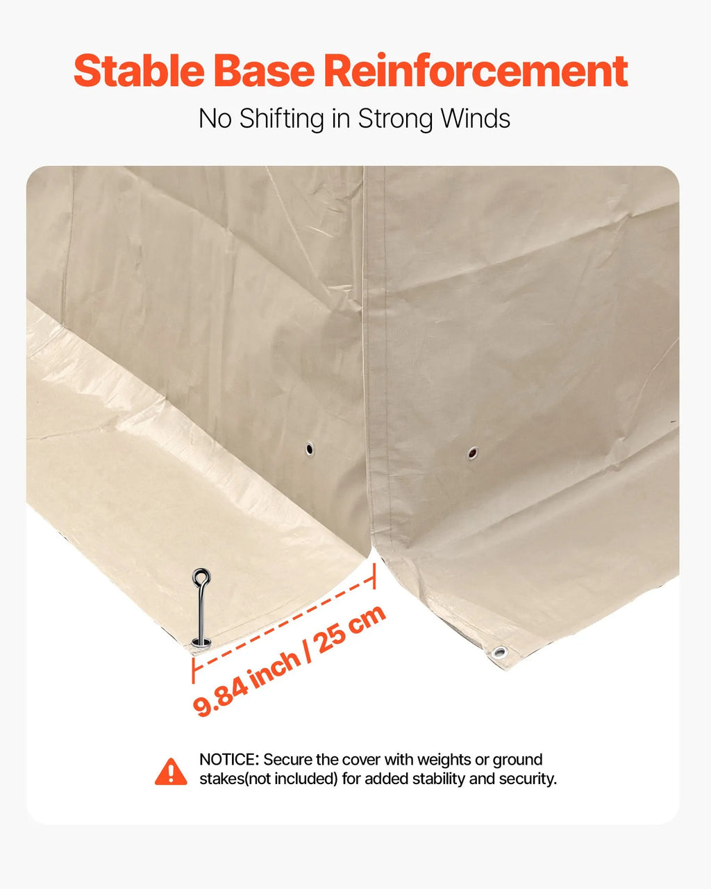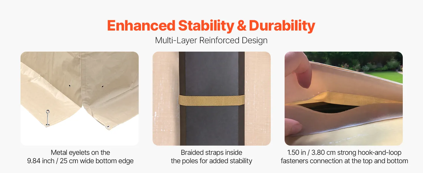 Šim universālajam ziemas paviljona pārsegam ir 25 cm garš grīdas svārks ar metāla gredzeniem pamatnes nostiprināšanai. Pastiprinātās stiprinājuma siksnas apvijas ap stabiem, bet 3,8 cm plati izturīgi līplentes stiprinājumi savieno paneļus kopā, nodrošinot papildu izturību pret vēju un stabilitāti.
