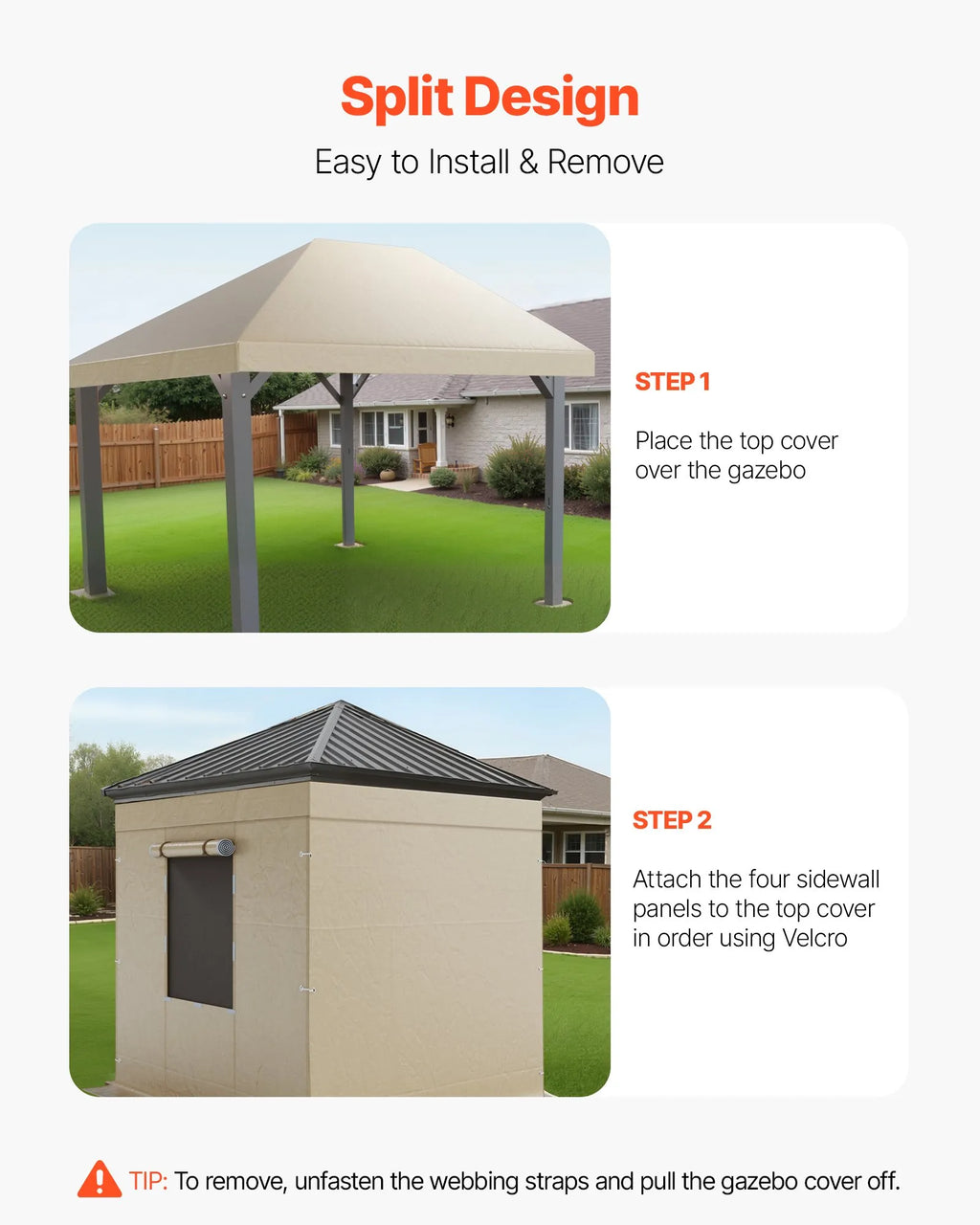 Vienkārša uzstādīšana: ūdensnecaurlaidīgais paviljona pārsegs sastāv no divām daļām ar līplentes savienojumiem, kas ļauj to viegli samontēt un noņemt. Jumta un sānu paneļus var atvienot atsevišķi, pielāgojot dažādiem gadalaikiem un lietošanas vajadzībām.