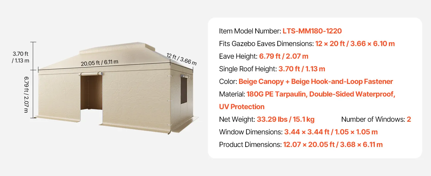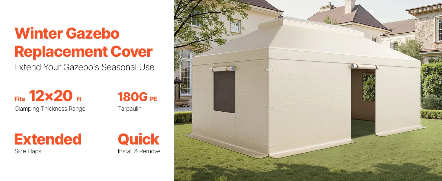 Piemērots 3,66 × 6,10 m paviljoniem: šis ziemas paviljona pārsegs ir paredzēts 3,66 × 6,10 m divslāņu jumta paviljoniem (paviljons nav iekļauts komplektā). Pārsegam ir jumta pārkares visās četrās pusēs, kas pielāgojas dažādiem augstumiem un slīpumiem, nodrošinot drošu un precīzu piegulšanu. Tas nodrošina pilnīgu pārklājumu, lai pasargātu Jūsu paviljonu.