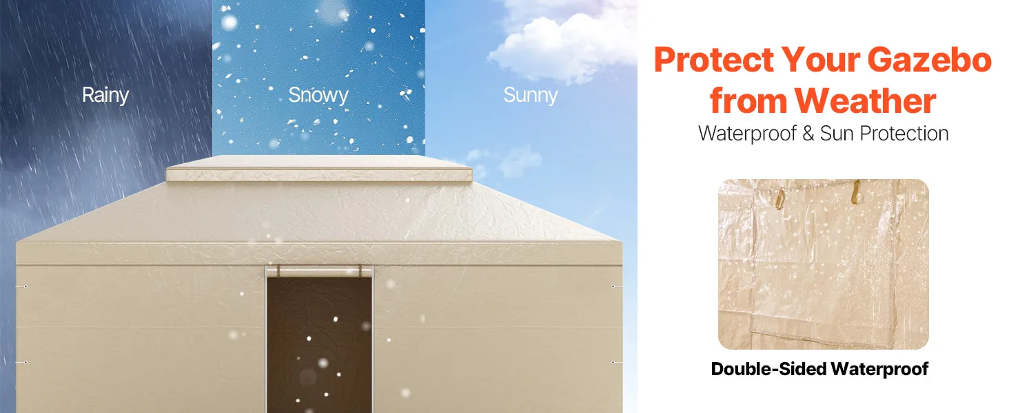 Izturīgs PE pārsegs: izgatavots no augstas stiprības 180 g/m² PE materiāla ar ūdensnecaurlaidīgu un saules starus bloķējošu pārklājumu abās pusēs. Divslāņu jumta cietā jumta paviljonu pārsegs efektīvi pasargā no vēja, stipra lietus, sniega un intensīvas saules, nodrošinot paviljona un mēbeļu drošību visu gadu.