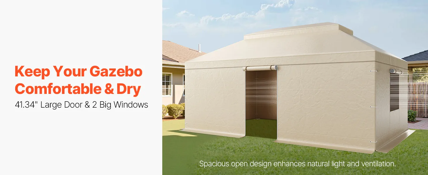 Vienkārša uzstādīšana: ūdensnecaurlaidīgais paviljona pārsegs sastāv no divām daļām ar līplentes savienojumiem, kas ļauj to viegli samontēt un noņemt. Jumta un sānu paneļus var atvienot atsevišķi, pielāgojot dažādiem gadalaikiem un lietošanas vajadzībām.