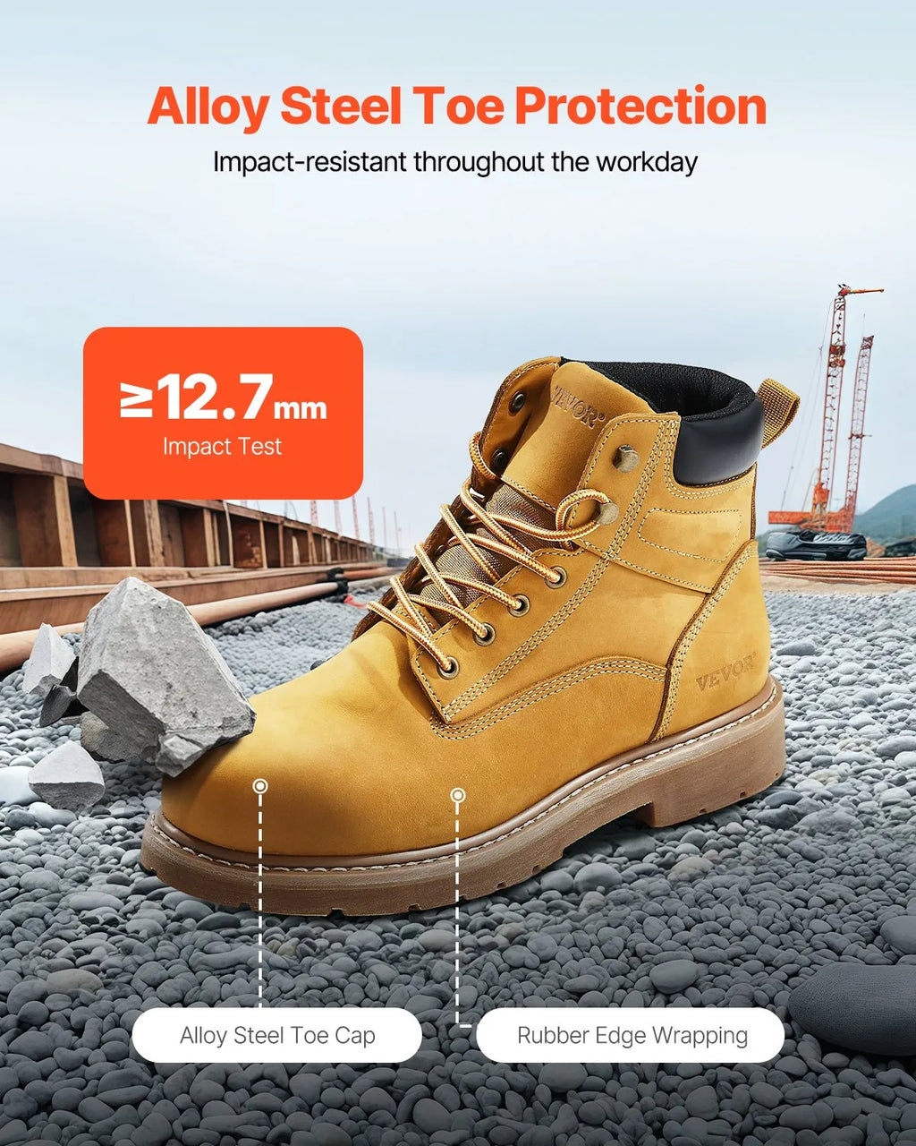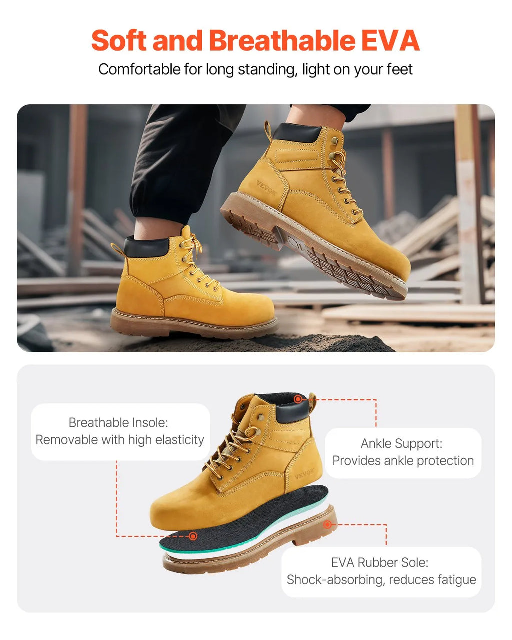 43_ChatGPT saka: VEVOR darba zābaki ar tērauda purngalu, izmērs UK 9 (ES 43), ūdensizturīgi vīriešu darba zābaki ar neslīdošu gumijas zoli, viegli un elpojoši, piemēroti rūpniecības un būvniecības darbiem, brūni dzelteni