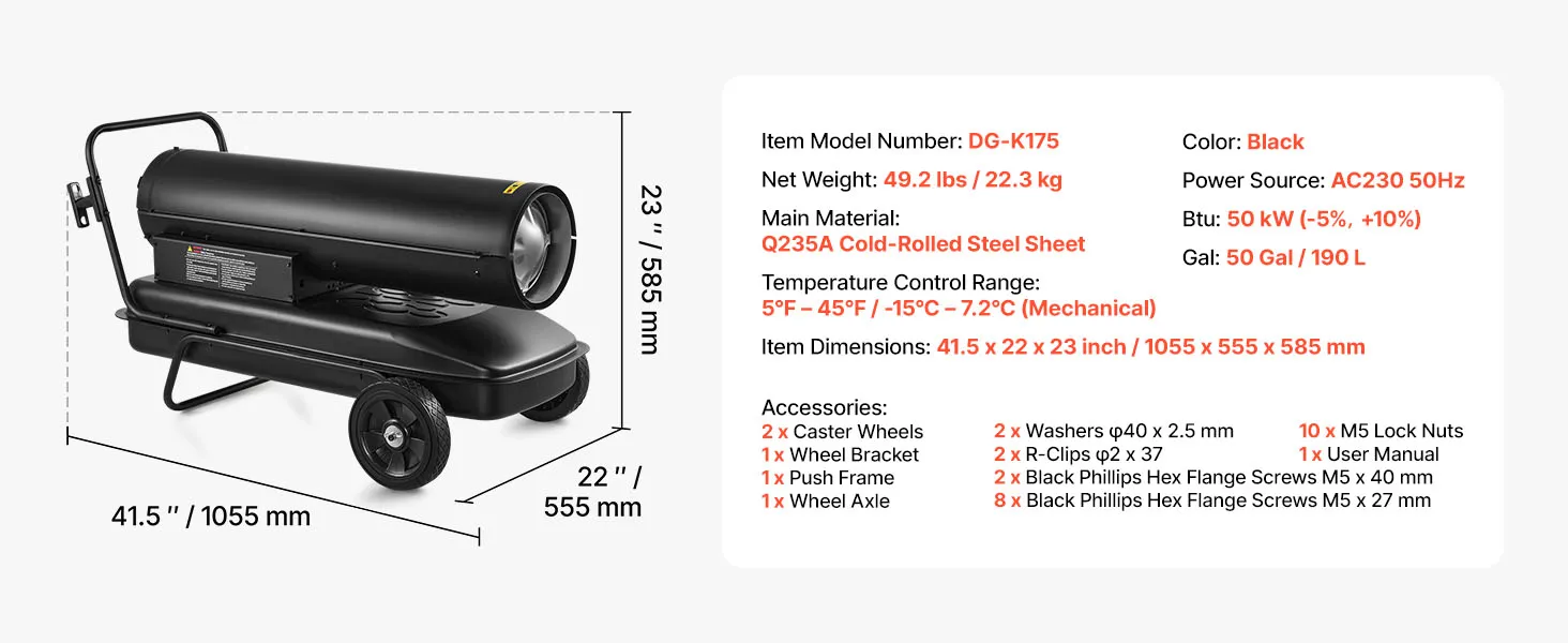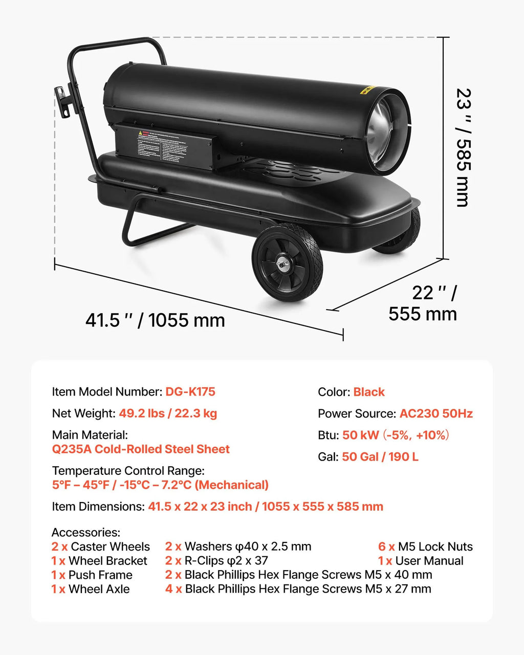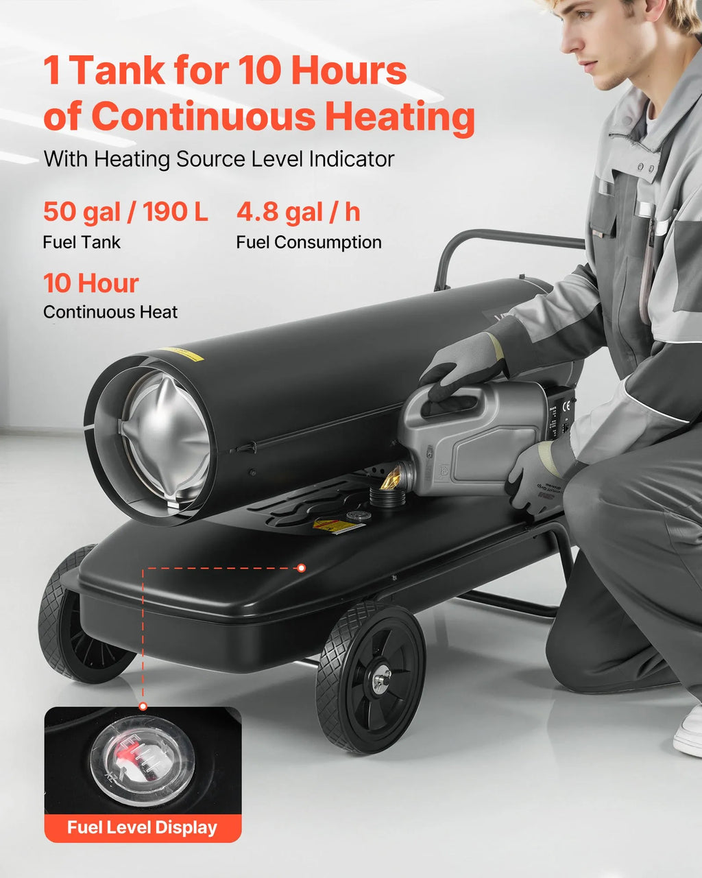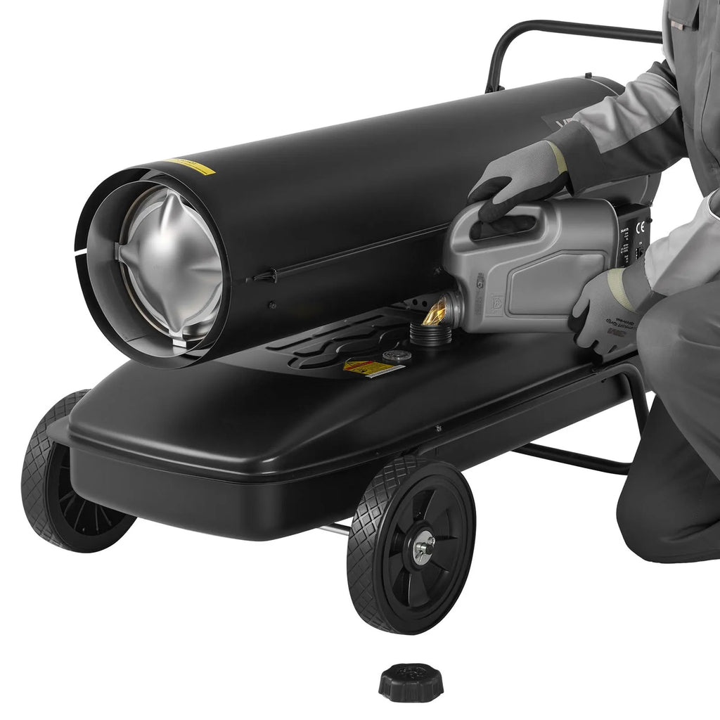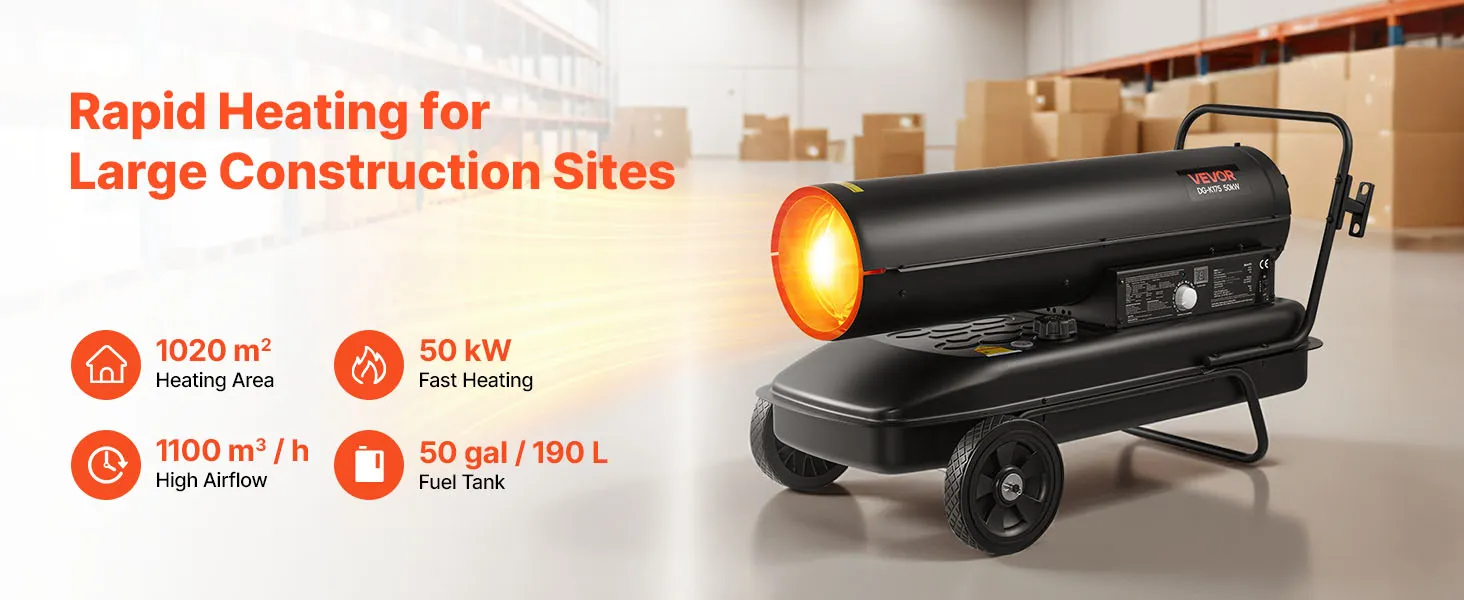 Šis piespiedu gaisa petrolejas/dīzeļdegvielas sildītājs nodrošina siltumu tikai 15 minūtēs, ideāli piemērots telpām līdz 1020 m². Ar 50 kW jaudu un 1100 m³/h gaisa plūsmu tas ātri un vienmērīgi sasilda pat lielas platības.