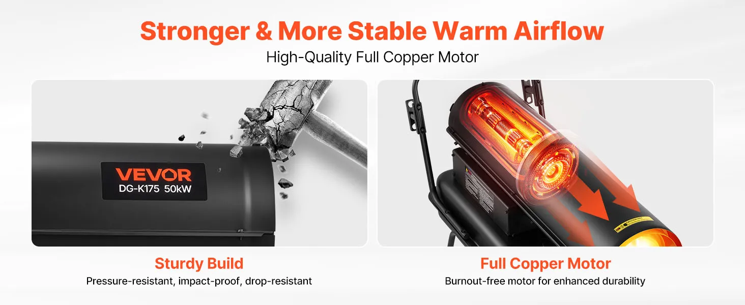 Aprīkots ar pilnībā vara motoru stabilai jaudai un ilgam kalpošanas laikam.