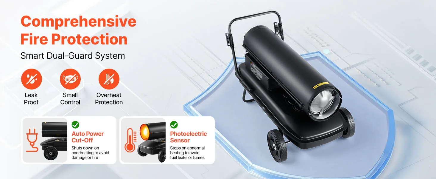 Aprīkots ar izturīgiem riteņiem, šis sildītājs vieglipārvietojams starp telpām vai darba vietām, nodrošinot siltumu tieši tur, kur tas nepieciešams visvairāk.