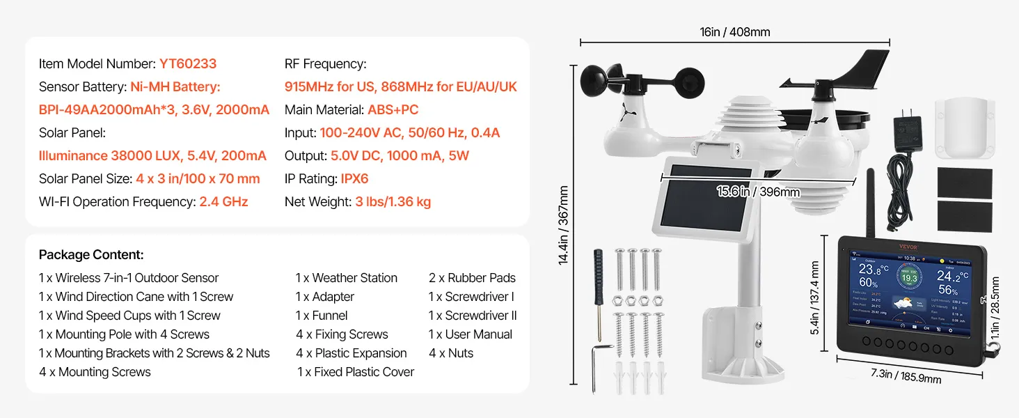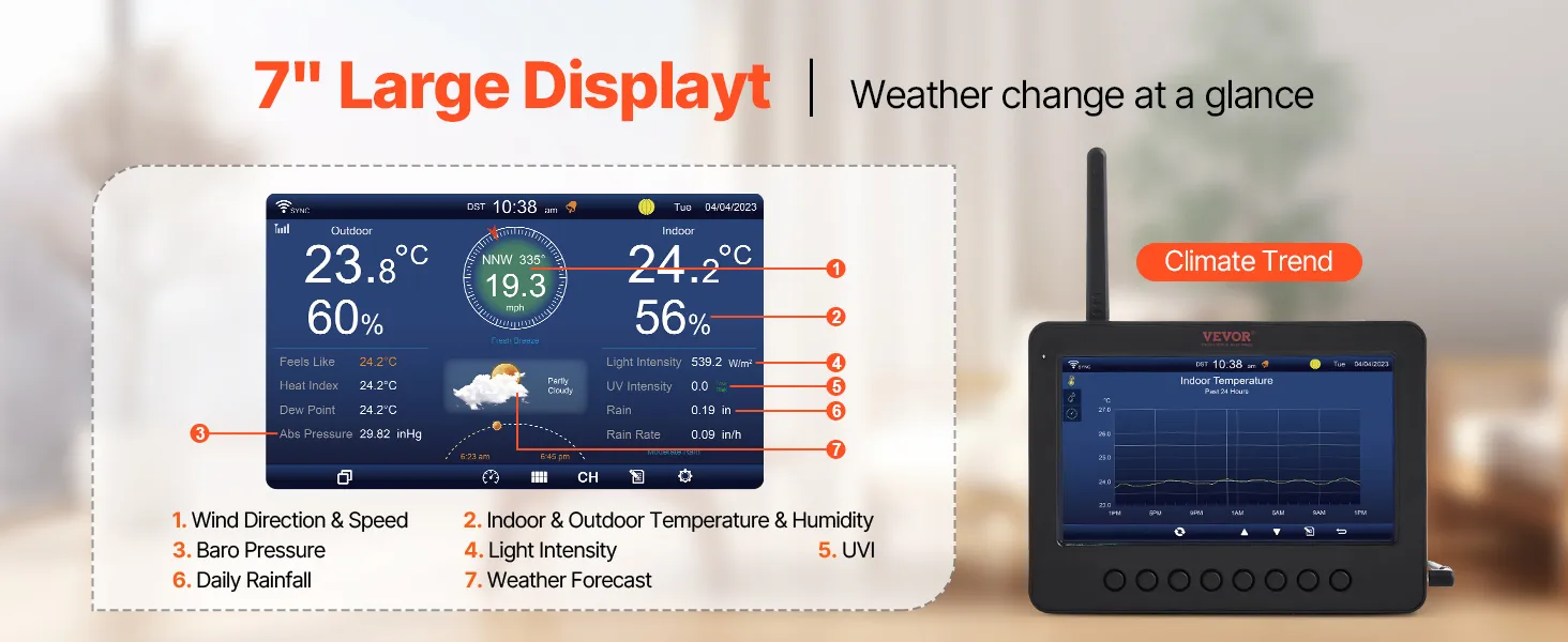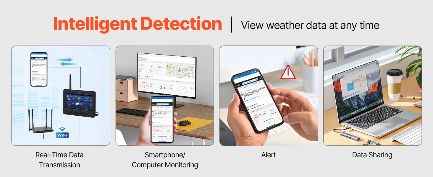 7-vienā sensors: mūsu Wi-Fi laikapstacija nodrošina precīzu vēja ātruma, vēja virziena, temperatūras, mitruma, nokrišņu un gaismas intensitātes mērījumu. Papildu tiek attēlots arī sajūtamais aukstums, rasas punkts, spiediens, kalendārs un Mēness fāze, ļaujot sekot laikapstākļu izmaiņām mājas apstākļos. Ar IPX6 ūdensizturības līmeni stacija spēj precīzi novērot laikapstākļu izmaiņas 6-12 stundu periodā pat stipra lietus laikā. Kad tiek sasniegtas iestatītās augstās vai zemās vērtības, trauksmes funkcija paziņo ar skaņas signālu.