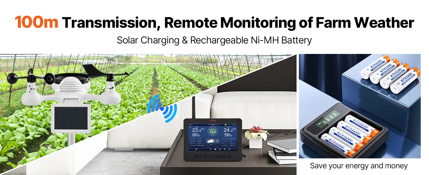 100 m pārraides attālums: saules enerģijas darbināmā laikapstacija piedāvā īpaši lielu signāla pārraides attālumu - līdz 100 metriem, kas ļauj brīvi izvietot sensorus ērtai uzraudzībai un lietošanai. Ideāli piemērota uzstādīšanai uz skursteņiem, jumtiem, pagalmos vai saimniecībās. Uzstādot sensorus, jāizvairās no TV uztvērējiem, mobilo sakaru torņiem un augstsprieguma līnijām, kas var radīt traucējumus.