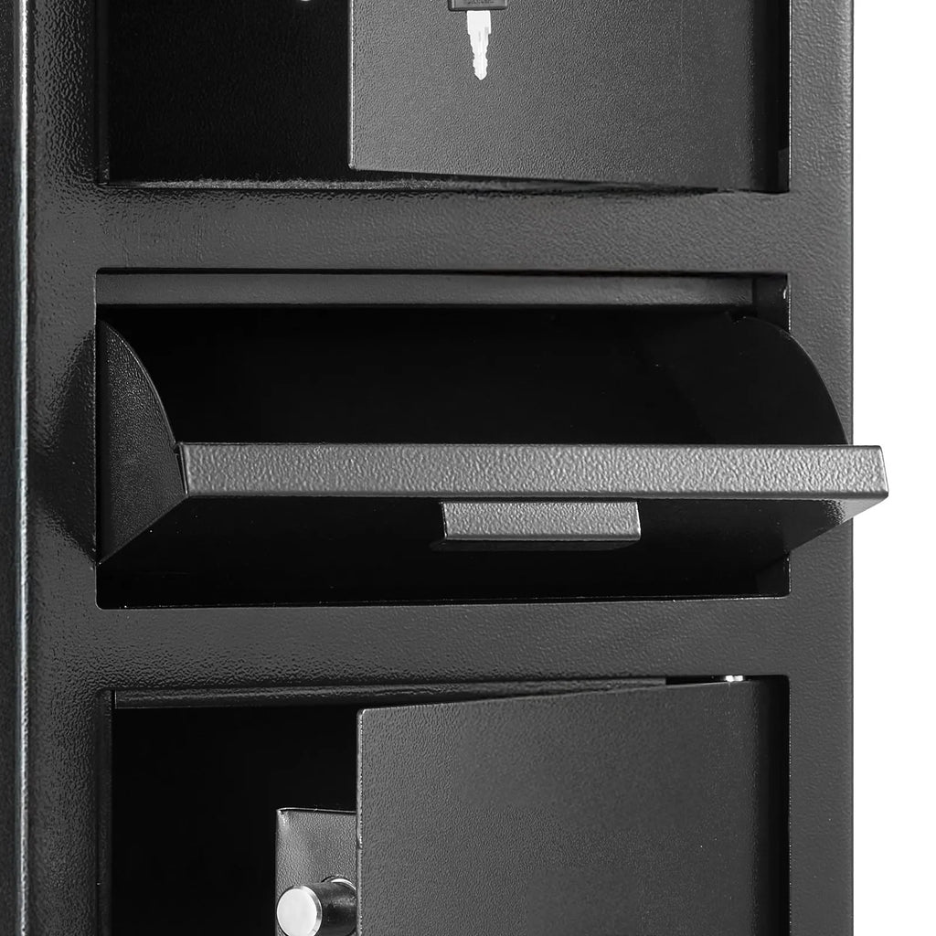 Pastiprināts drošības dizains: Pagarināta pretizvilkšanas iemaksas atvere ar pretzagšanas zobiem. Masīvs oglekļa tērauda korpuss ar pilnu metinājumu, trim 20 mm aizslēga tapām un biezu durvju pretuzlaušanas konstrukciju nodrošina izcilu aizsardzību pret ielaušanos.
