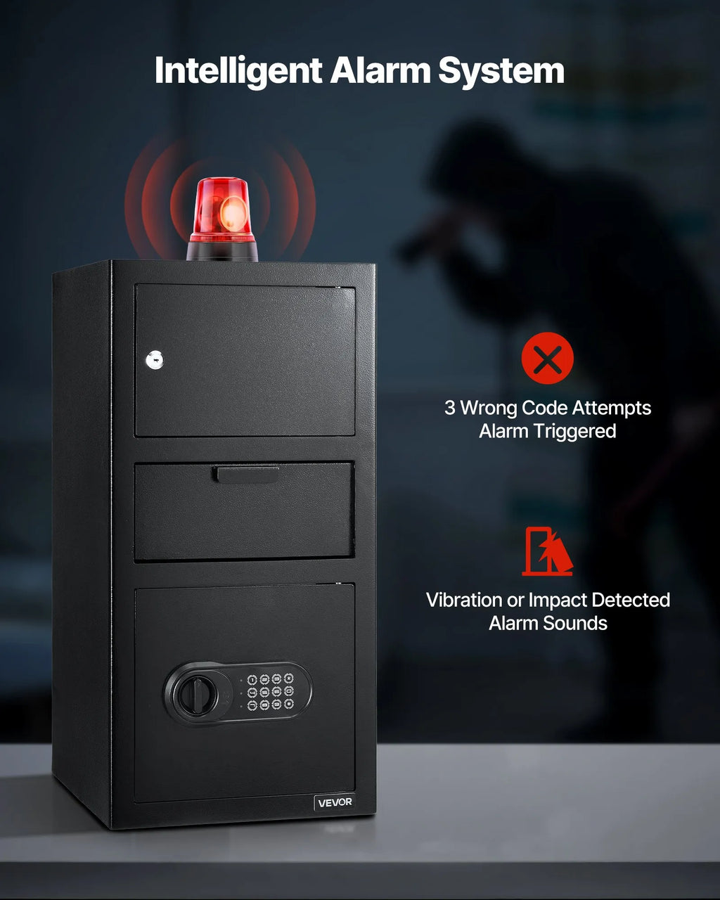 Dubultā signalizācijas sistēma: Seifs ar iemaksas atveri aktivizē skaļu signalizāciju pēc 3 nepareizi ievadītiem PIN mēģinājumiem vai spēcīga trieciena. Brīdina par nesankcionētu piekļuvi un attur iebrucējus.