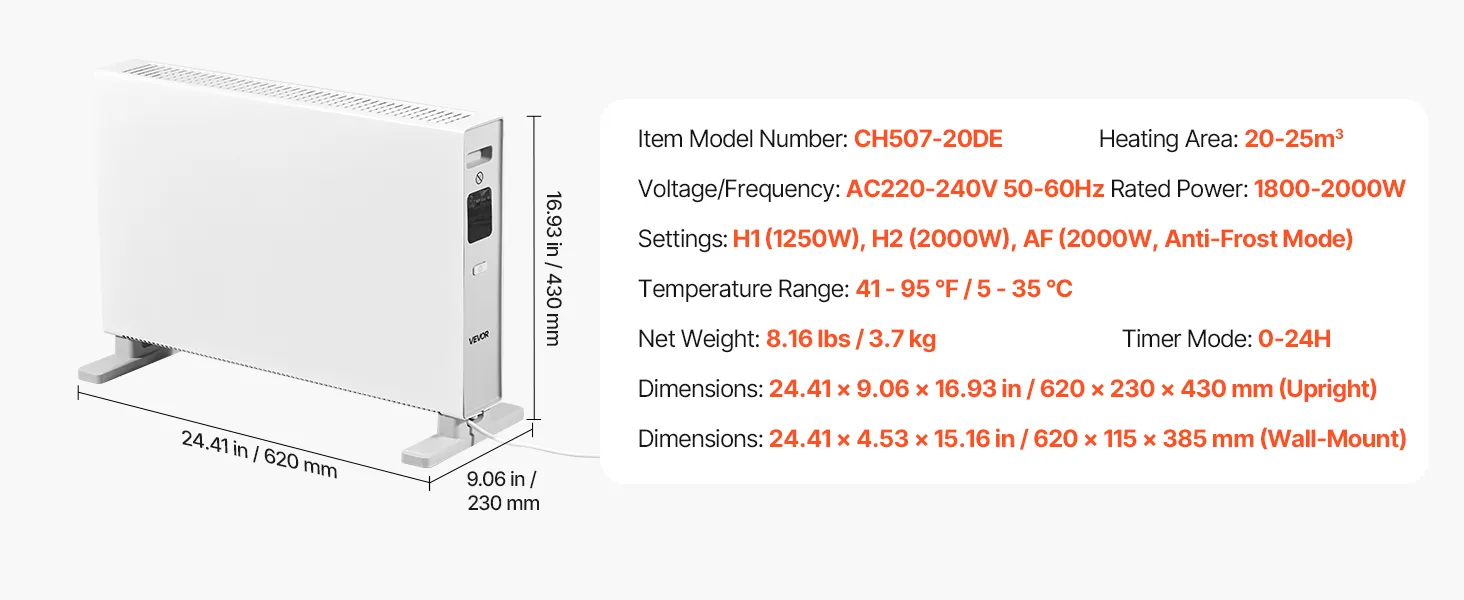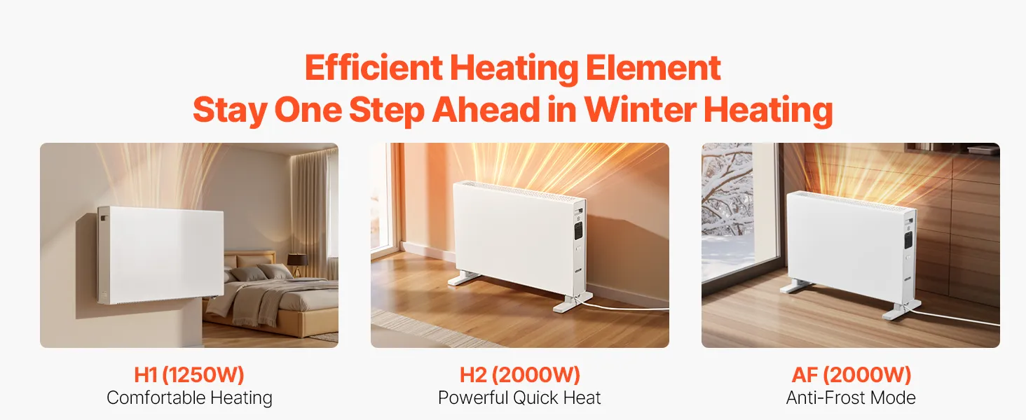 Vienkārša režīmu pārslēgšana: Iebūvēti H1 (1250 W), H2 (2000 W) un AF (pret sasalšanu, 2000 W) režīmi, kurus iespējams pārslēgt ar vienu pogu. Temperatūras iestatījumu diapazons ir no 5 °C līdz 35 °C. Ierīcei ir arī iknedēļas taimeris papildu ērtībai.