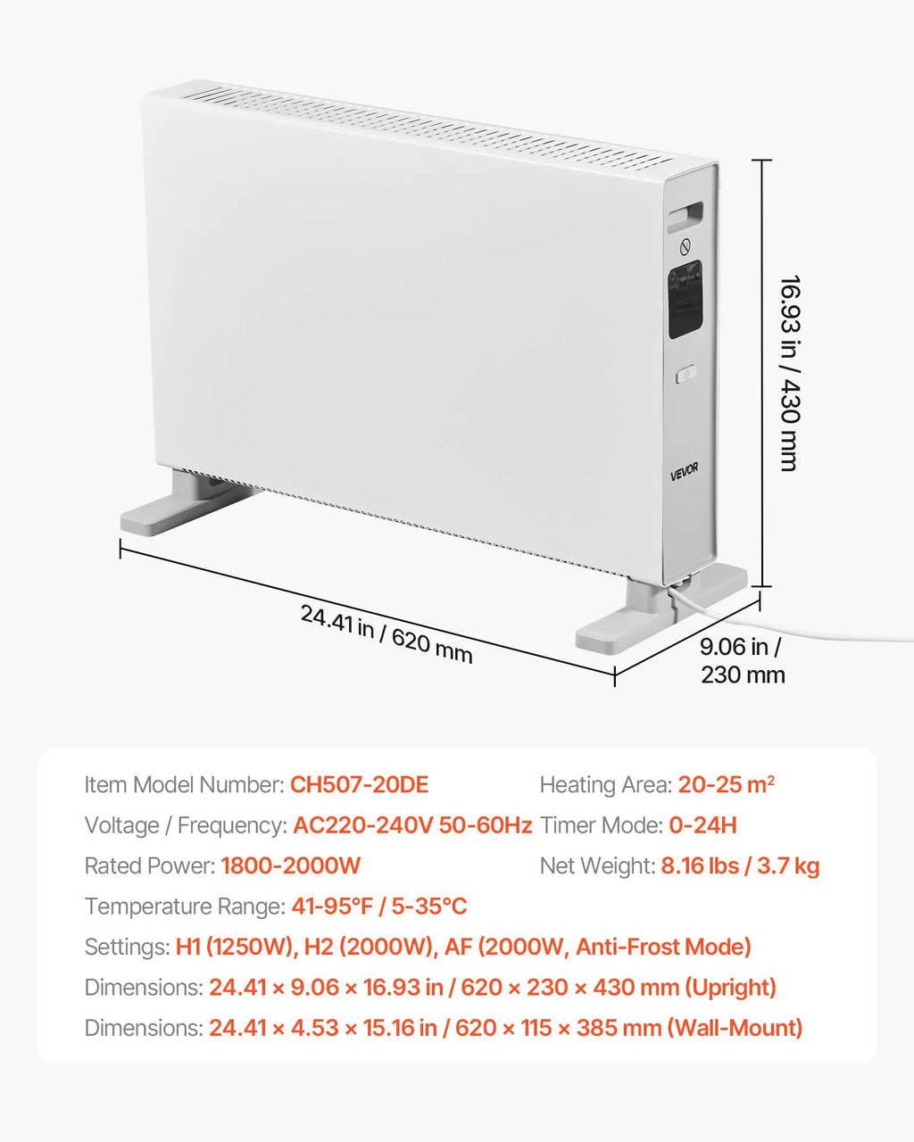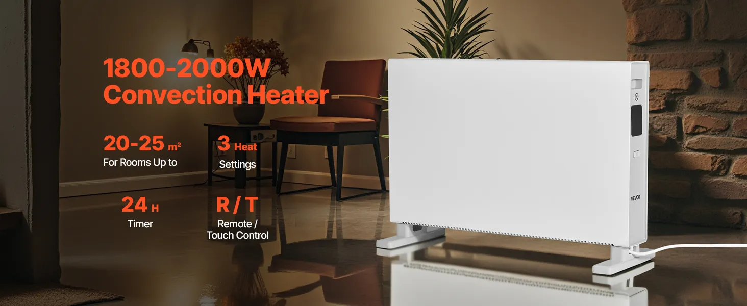 Ātra uzsildīšana un siltums: Ar 1250-2000 W jaudu un augstas kvalitātes sildīšanas elementiem šis konvekcijas paneļu sildītājs ātri sasilda telpu 20-25 m² platībā. Aukstā laikā tas nodrošina tūlītēju siltumu un patīkamu komfortu uzreiz pēc ieslēgšanas.