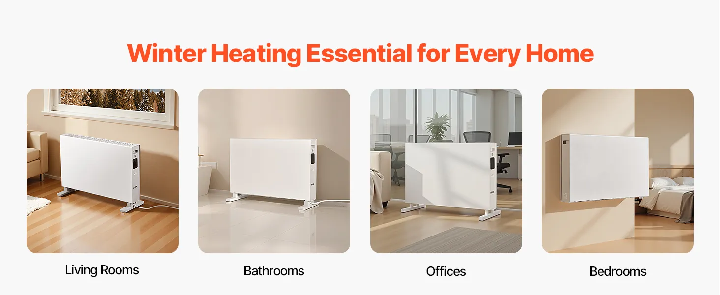 Sienas vai grīdas uzstādīšana: Kompaktais paneļu sildītājs piemērots gan montāžai pie sienas viesistabā vai virtuvē, gan novietošanai uz grīdas guļamistabā vai birojā. Tas nodrošina elastīgas uzstādīšanas iespējas, pielāgojoties dažādām apkures vajadzībām.