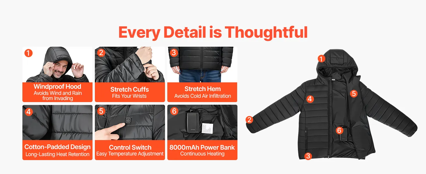 Regulējama kapuce, aproces un apakšmala nodrošina aizsardzību pret vēju, savukārt vienkārša viena taustiņa vadība un 8000 mAh akumulators padara šo ar USB darbināmo apsildāmo jaku ideāli piemērotu ikdienas lietošanai.