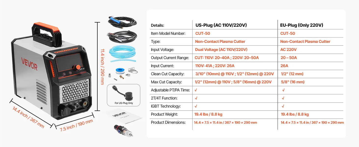 VEVOR plazmas griezējs nodrošina maksimālo izejas strāvu 50 A ar augstu griešanas jaudu. Tas ļauj veikt tīru griezumu līdz 12 mm un maksimālo griešanas biezumu līdz 16 mm.