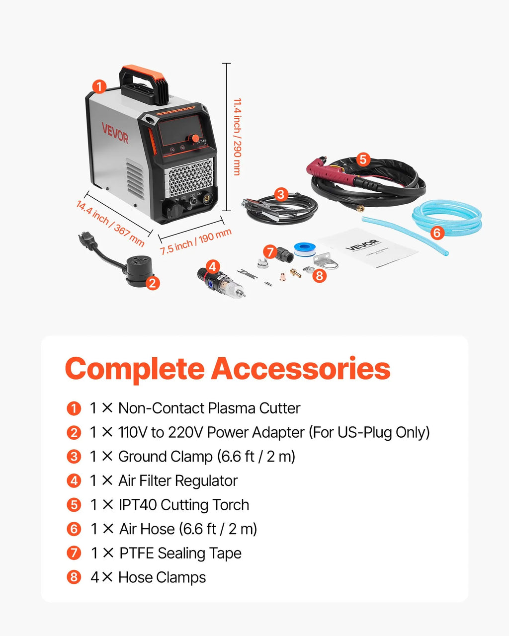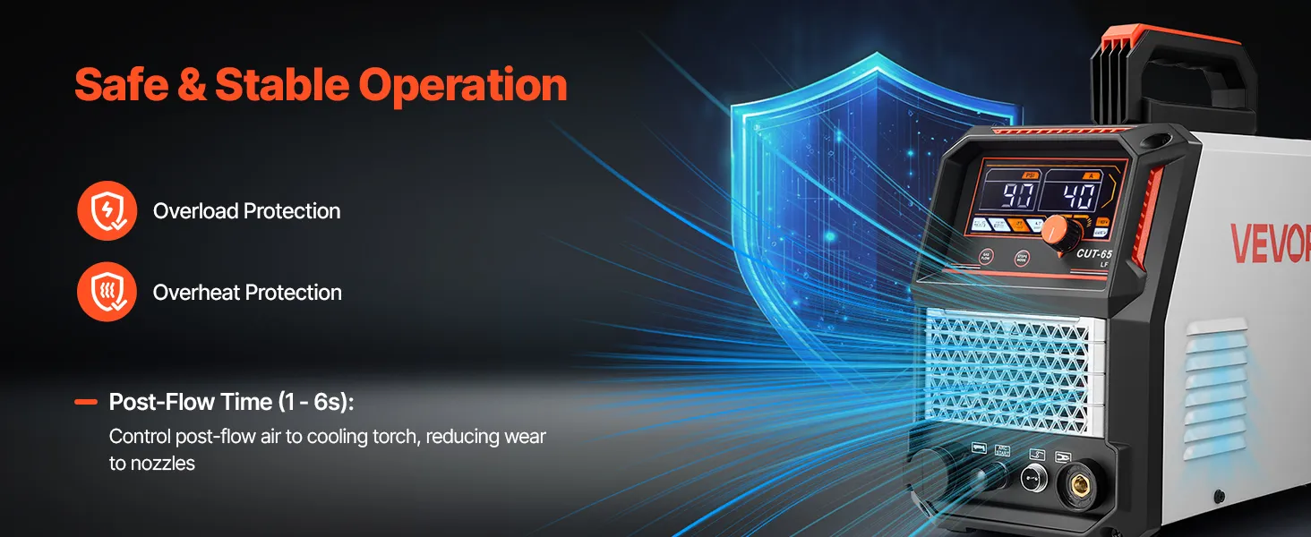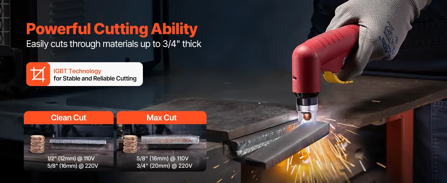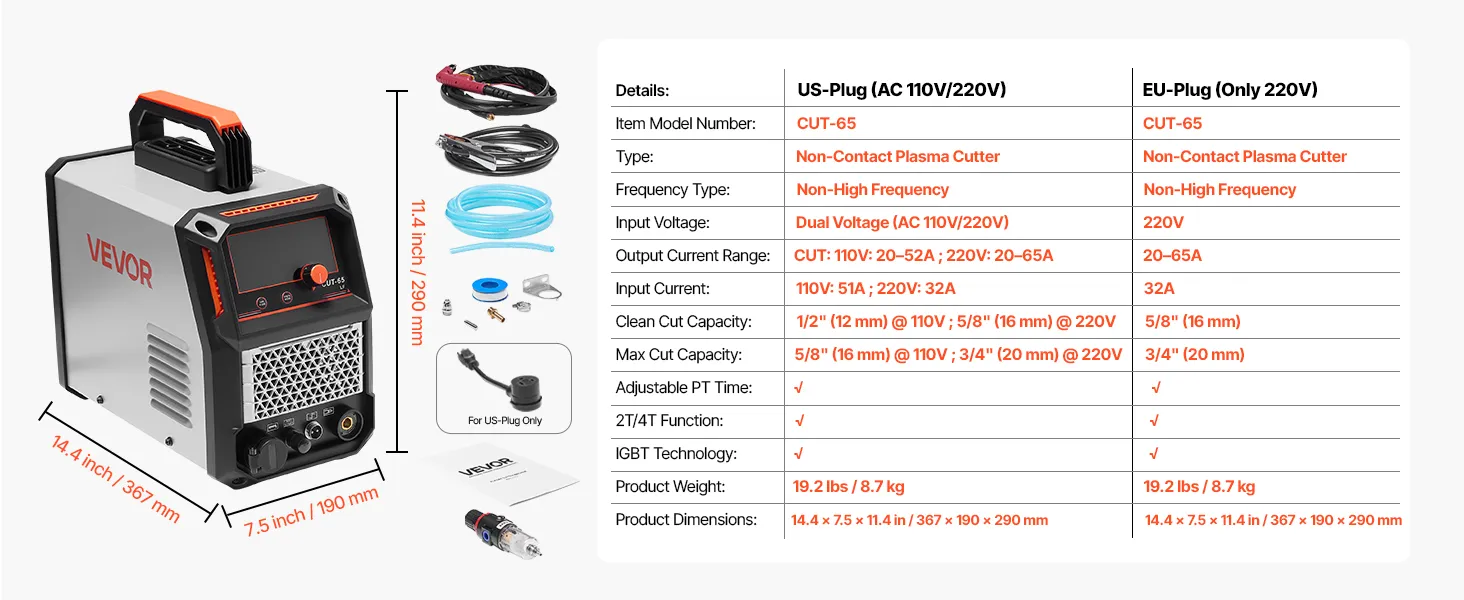 VEVOR plazmas griezējs nodrošina maksimālo izejas strāvu 65 A ar augstu griešanas jaudu. Tas ļauj veikt tīru griezumu līdz 16 mm biezumā un maksimālo griezuma dziļumu līdz 20 mm. (Piezīme: darbojas tikai ar 220 V spriegumu. Barošanas adapteris nav iekļauts komplektā.)