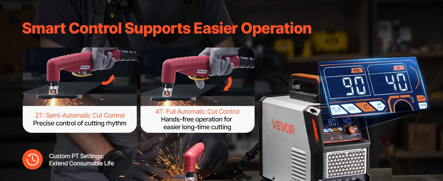 Plazmas griezējam ir regulējams PT laiks (1-6 s), kas pagarina patēriņa detaļu kalpošanas ilgumu. Aprīkots ar 2T/4T funkcijām: 2T režīms paredzēts īsiem un precīziem griezumiem, savukārt 4T režīms ļauj veikt ilgstošu, nepārtrauktu griešanu automātiskajā režīmā.