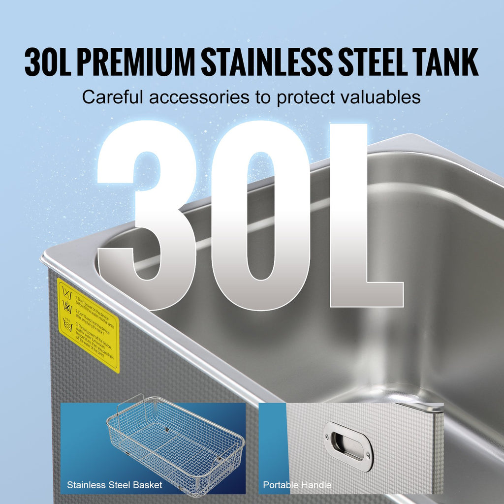 30 litru tvertne un grozs izgatavoti no augstas kvalitātes SUS304 nerūsējošā tērauda, droši notur un rūpīgi attīra dažādus vērtīgus priekšmetus, piemēram, rotaslietas, brilles un pulksteņus. Pievērsta uzmanība detaļām, lai katrs priekšmets saņemtu precīzu un saudzīgu tīrīšanu.