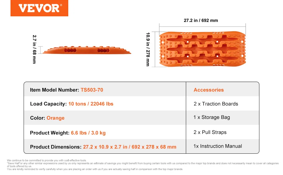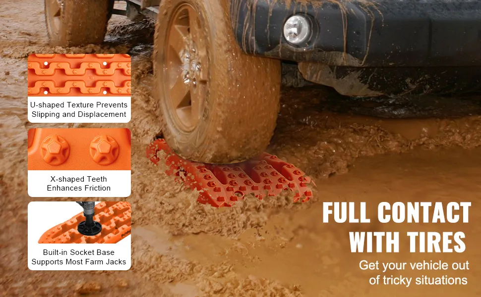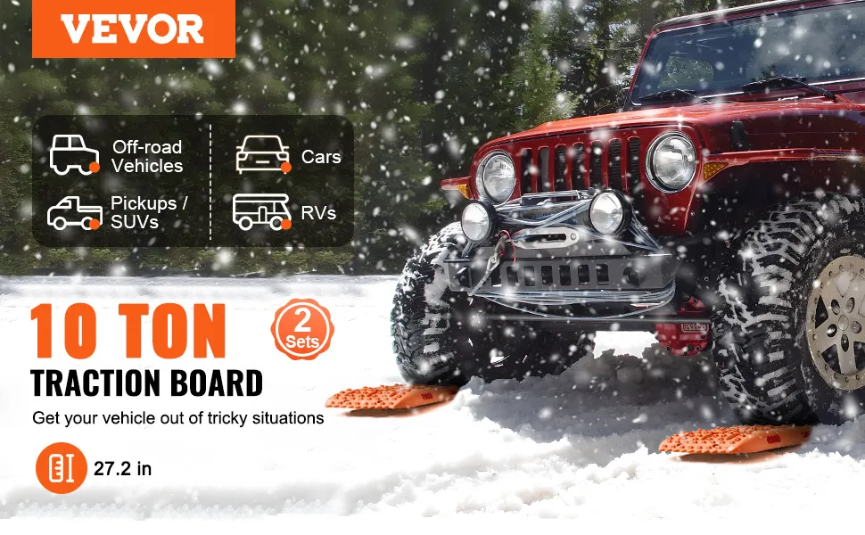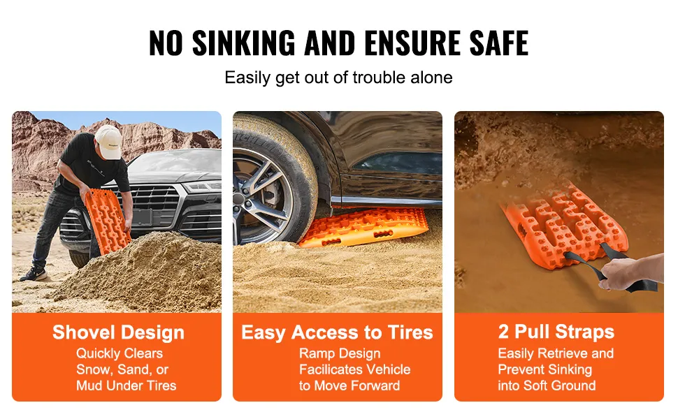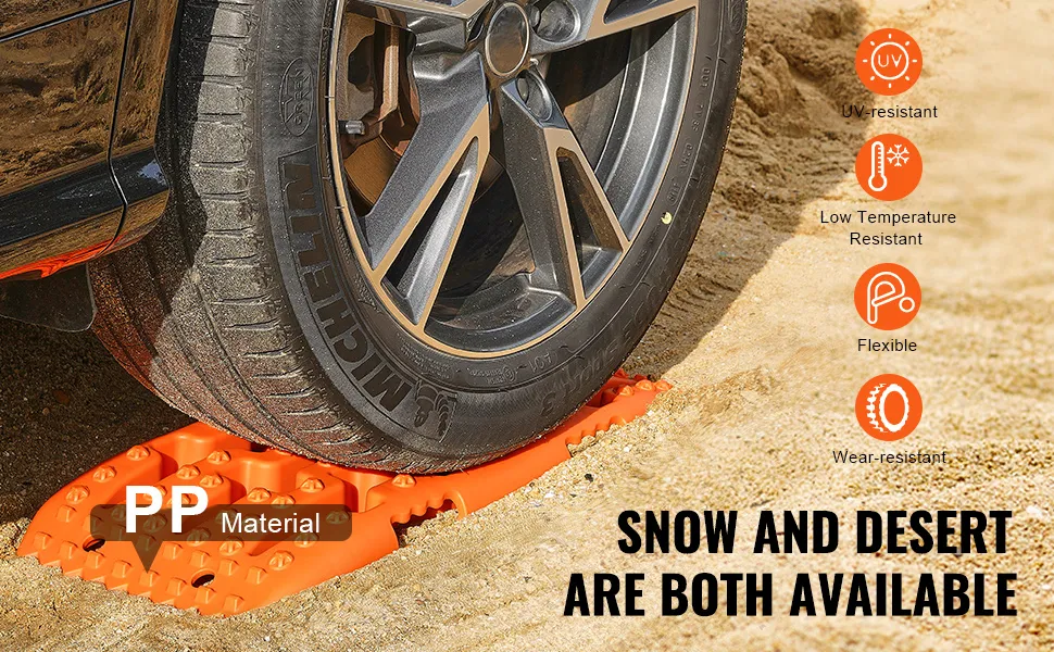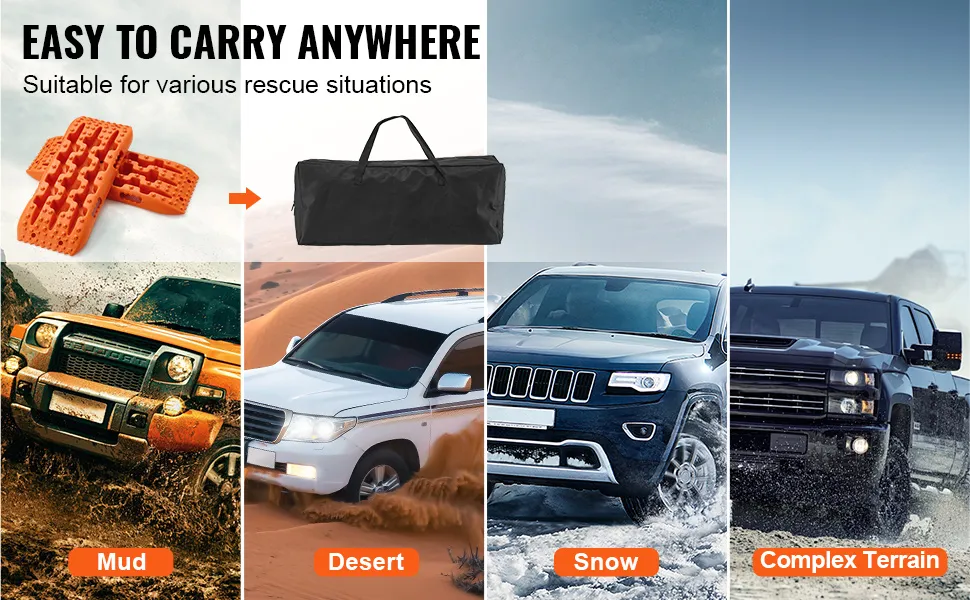 VEVOR 10 t PP saķeres dēļi bezceļu transportlīdzekļiem, īsie oranžie riepu saķeres paklāji sniegam, smiltīm, dubļiem un irdenam reljefam, ar uzglabāšanas somu