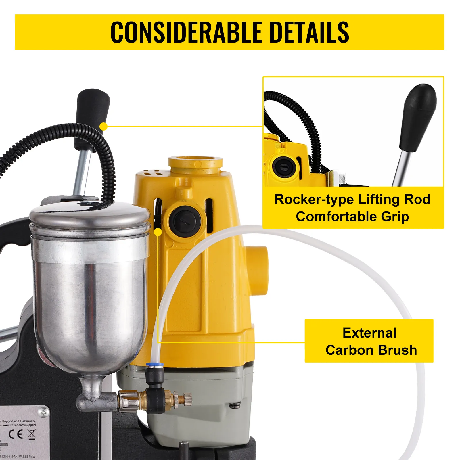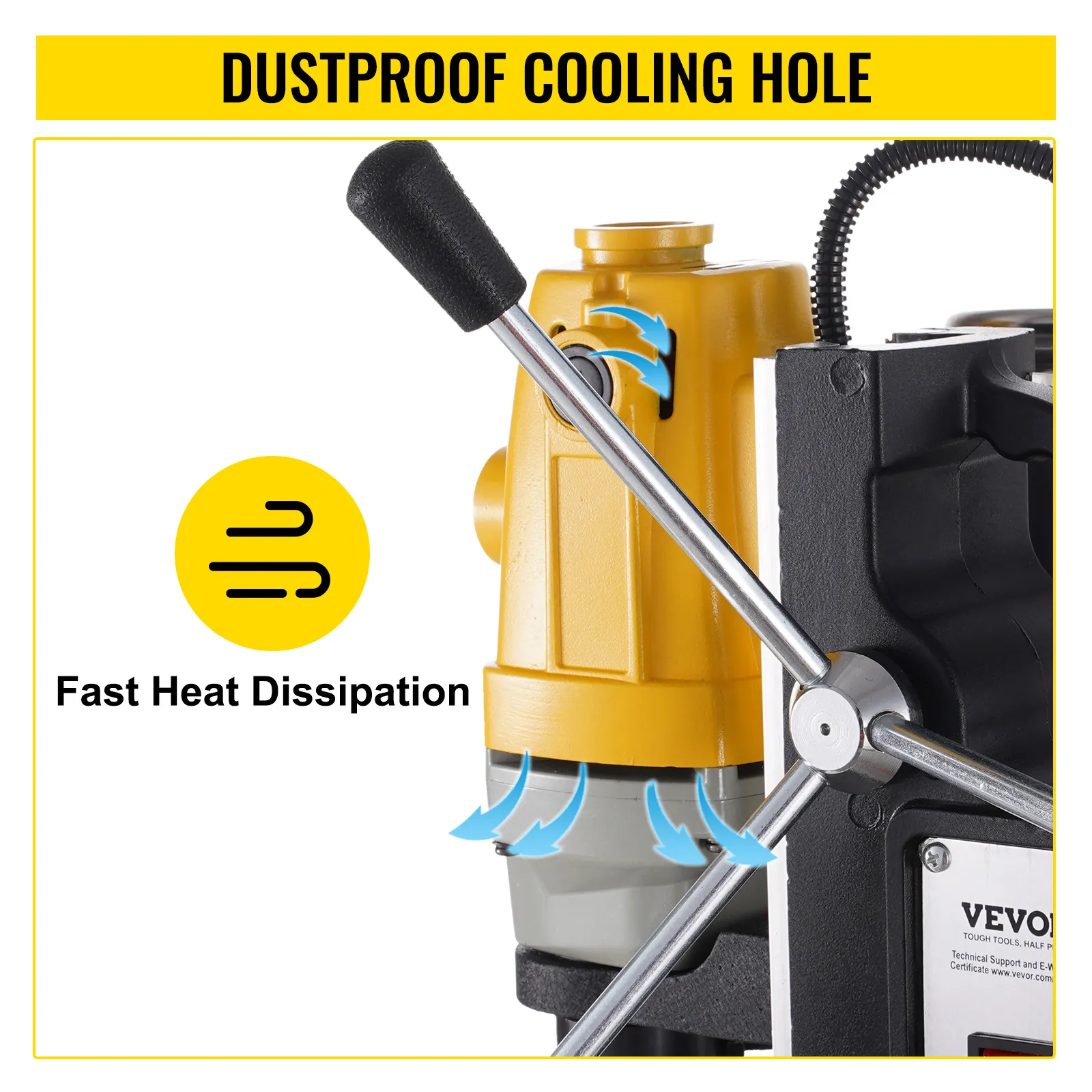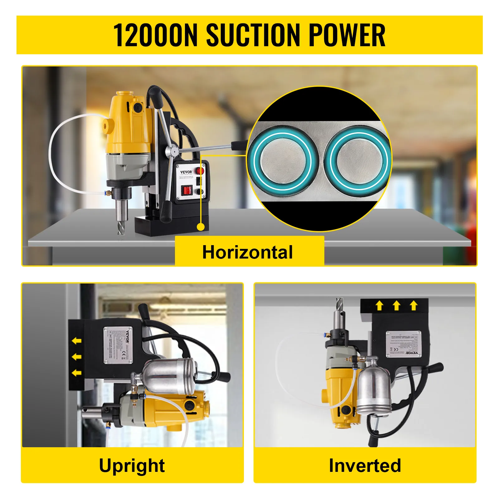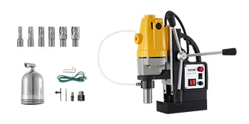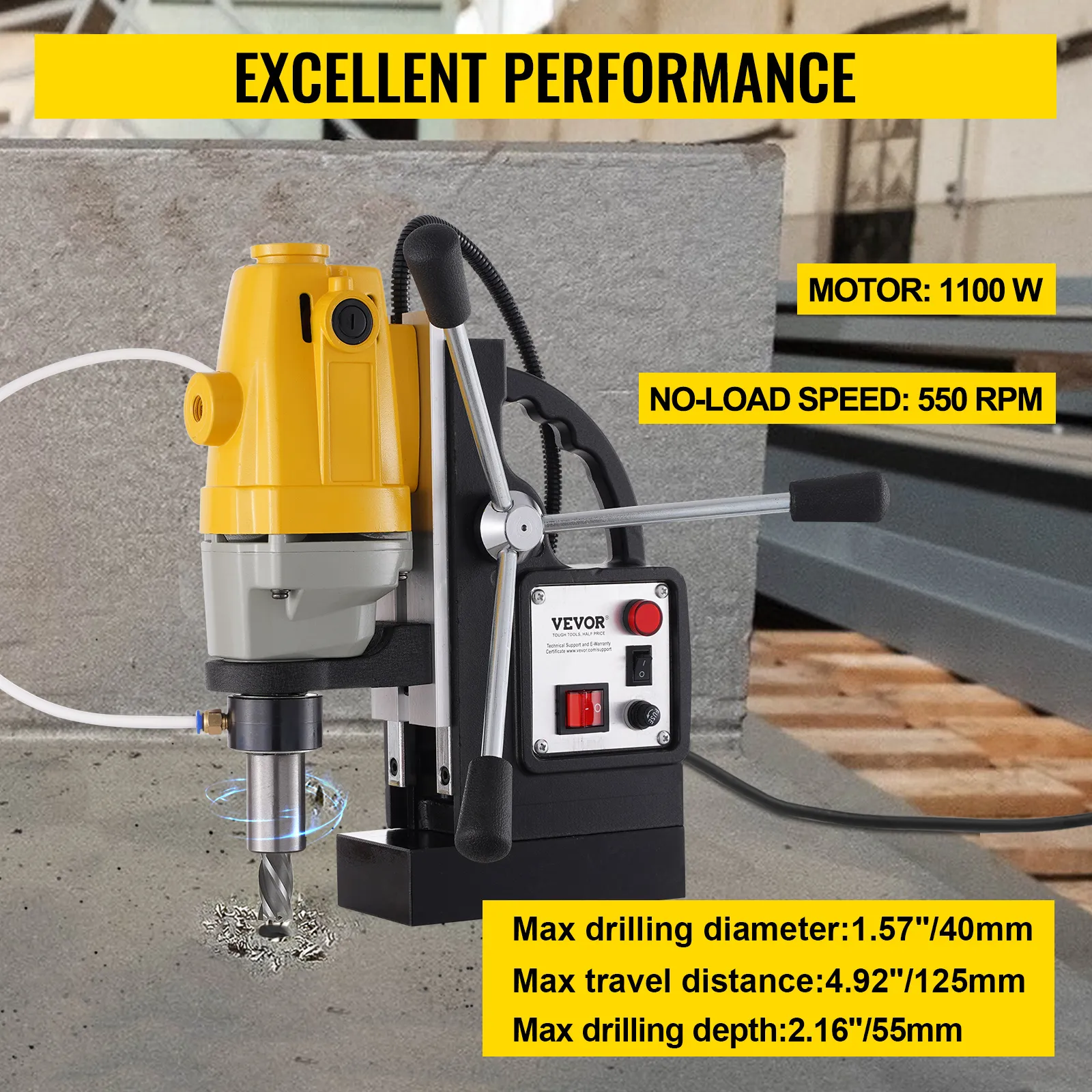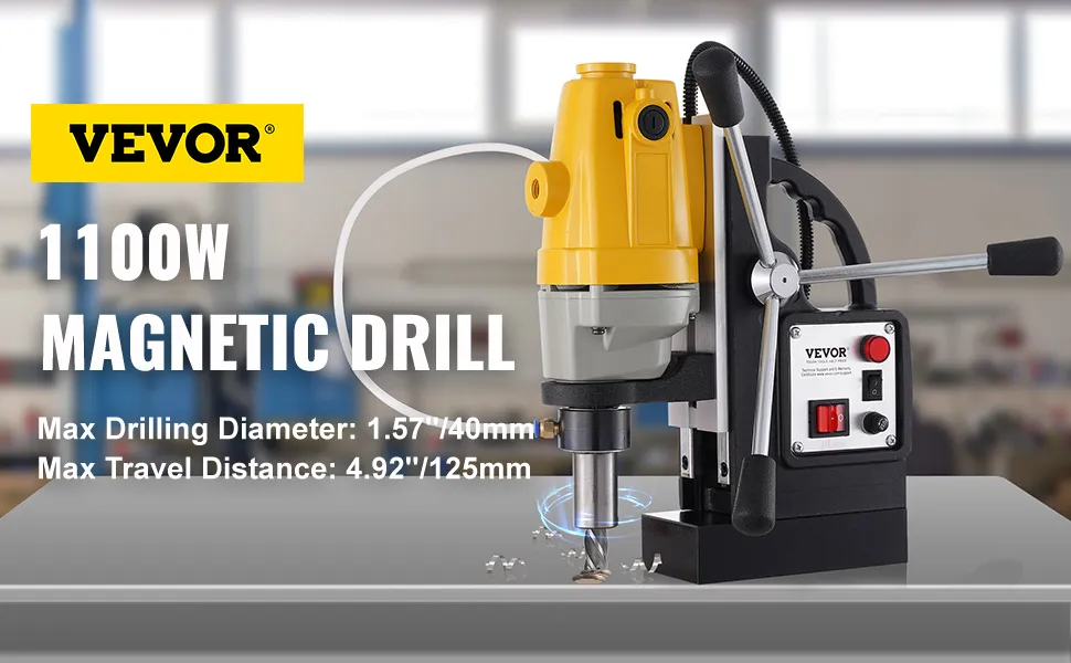 12 000 N magnētiskais spēks: Jaudīgais divpakāpju magnēts rada 12 000 N noturības spēku, nodrošinot, ka urbjmašīna darba laikā nekustas. Pateicoties elektromagnētiskajai pamatnei ar masīvu dzelzs apakšu, ierīce sevi droši nostiprina uz darba virsmas.