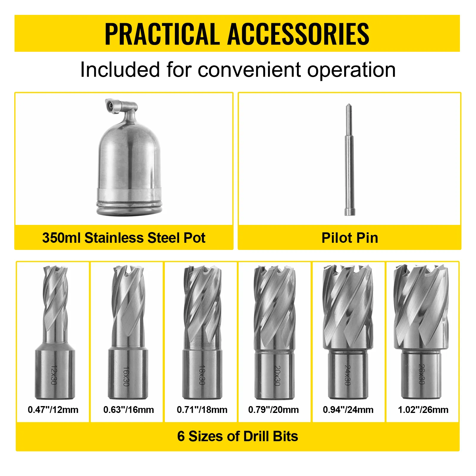 6 vainadziņi atbilst dažādām darba prasībām, un tos var uzstādīt tieši, neizmantojot urbja patronu. Ērtākai darbībai komplektā ir iekļauts arī nerūsējošā tērauda dzesēšanas trauks un centrēšanas tapa.