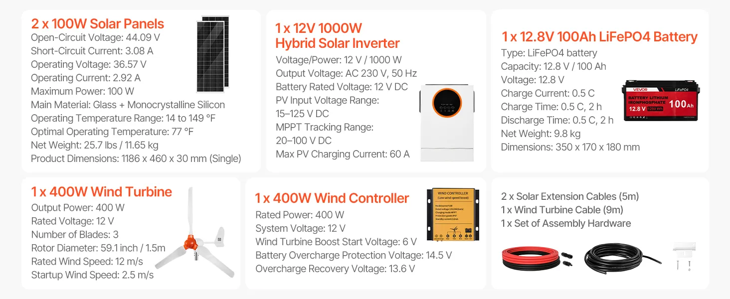 Viegli uzstādāms komplekts. Ietver 2 × 100 W saules paneļus, 1 × 400 W vēja turbīnu, 1 × MPPT vēja kontrolieri, 1 × 12 V 1000 W hibrīdo saules invertoru, 1 × 12,8 V 100 Ah LiFePO₄ akumulatoru, 2 × 5 m saules pagarinājuma kabeļus, 1 × 9 m vēja turbīnas kabeli un 1 stiprinājumu komplektu.