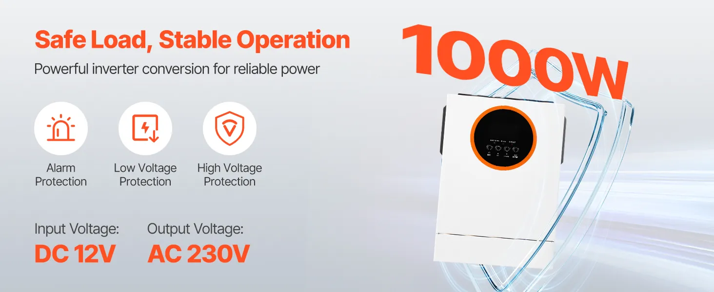 12 V 1000 W hibrīdais saules invertors efektīvi pārveido līdzstrāvu 12 V par maiņstrāvu 230 V, padarot to ideāli piemērotu dažādu ierīču un elektroiekārtu darbināšanai mājās, kemperos vai autonomās sistēmās. Iebūvētā daudzkārtējā aizsardzība nodrošina drošu un uzticamu darbību.
