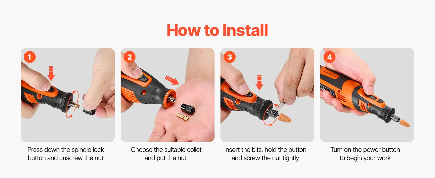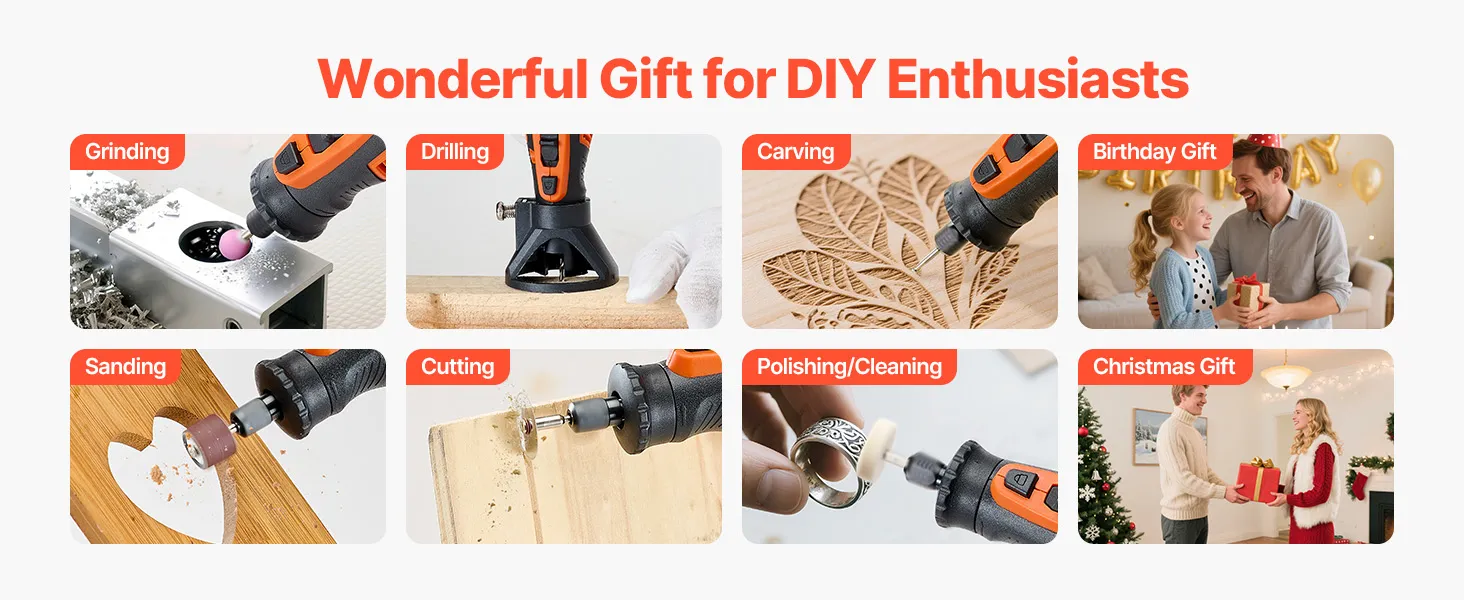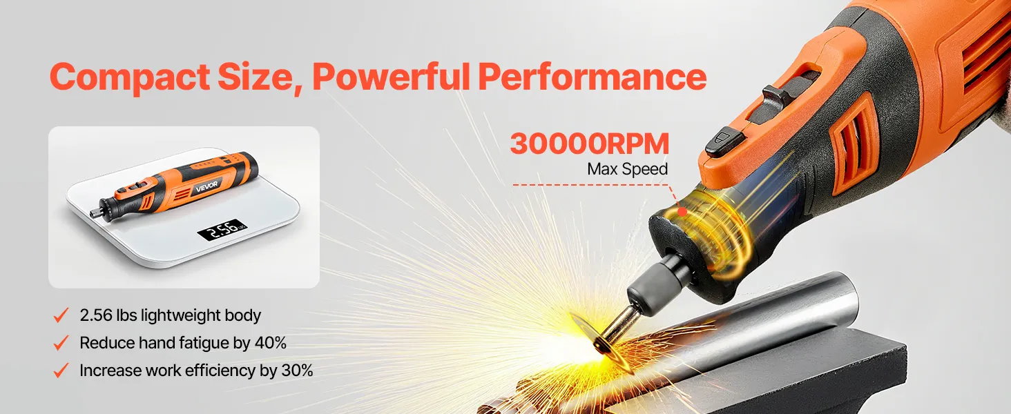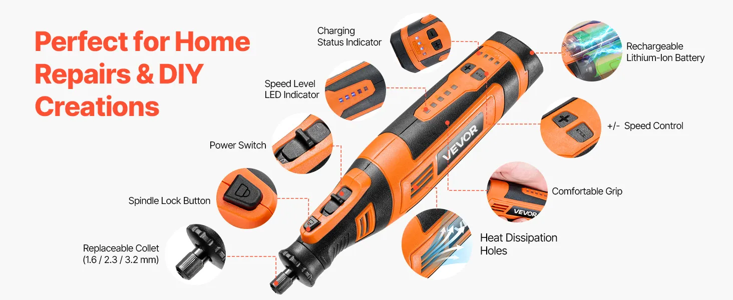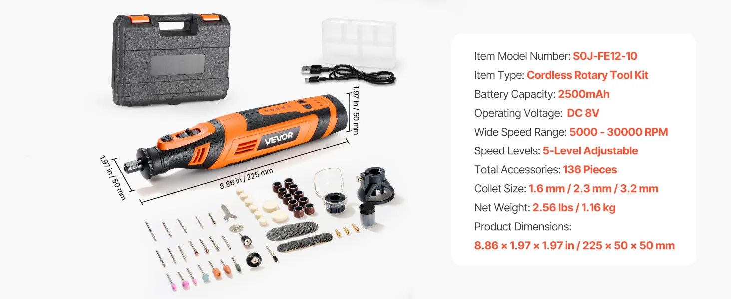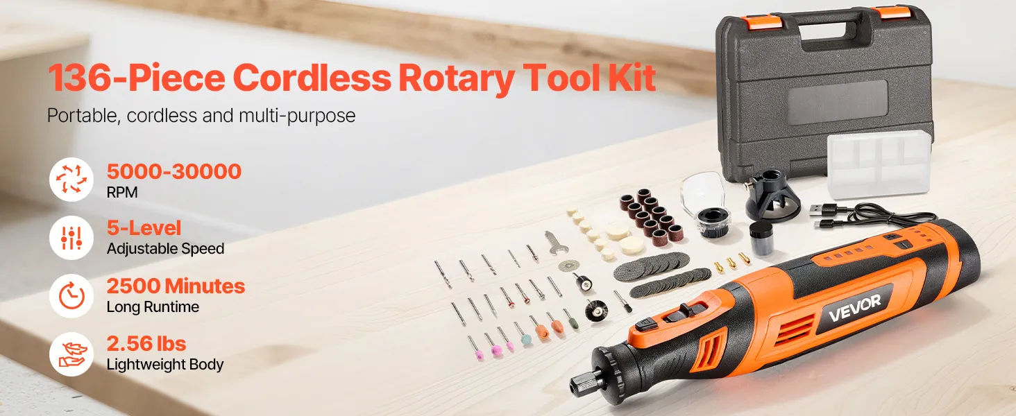 VEVOR 136 daļu bezvadu DC 8 V mini rotācijas instruments ar 5 ātrumiem (5000–30000 apgr./min.) gravēšanai, slīpēšanai, pulēšanai, grebšanai, asināšanai, griešanai un rokdarbiem