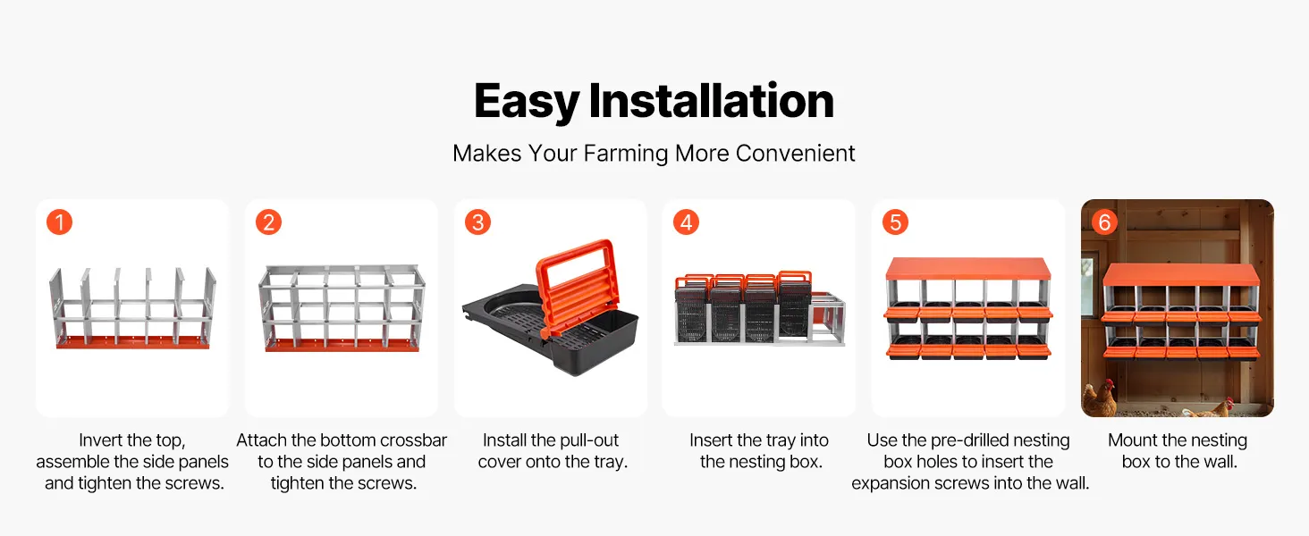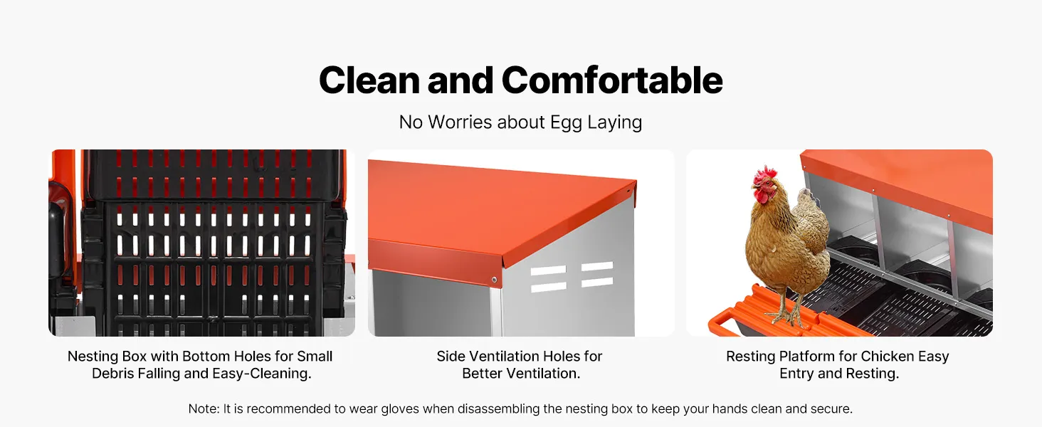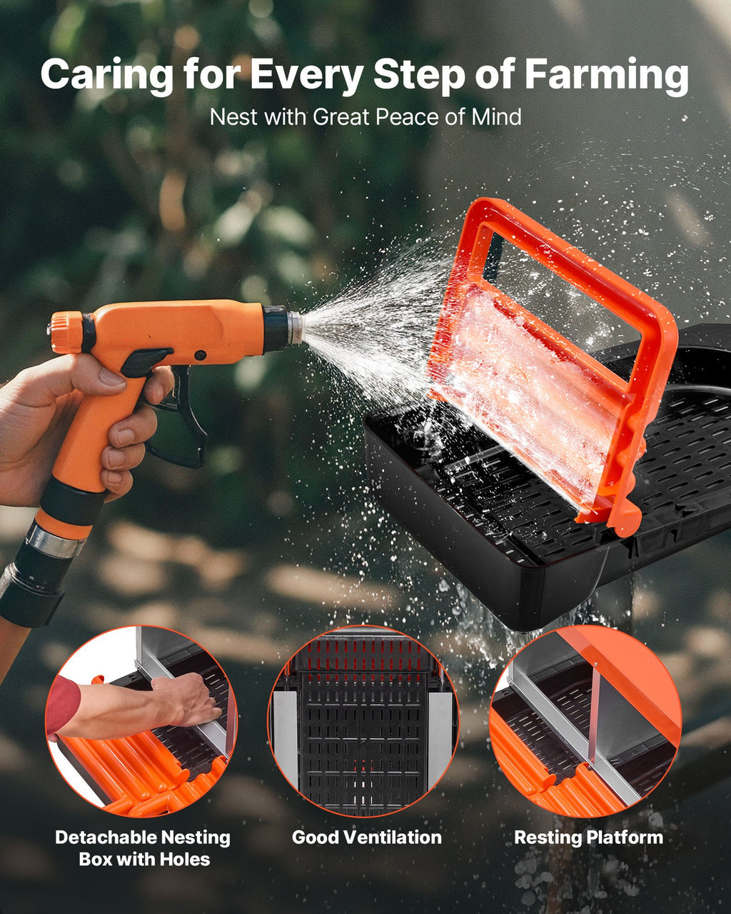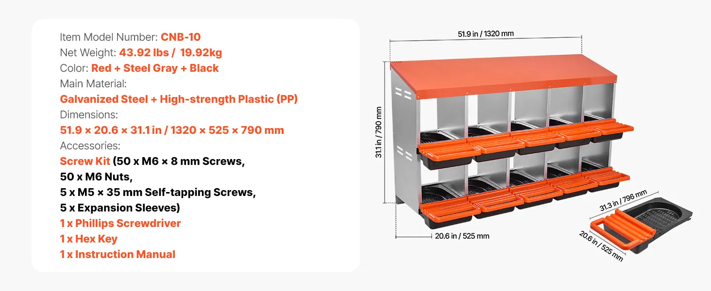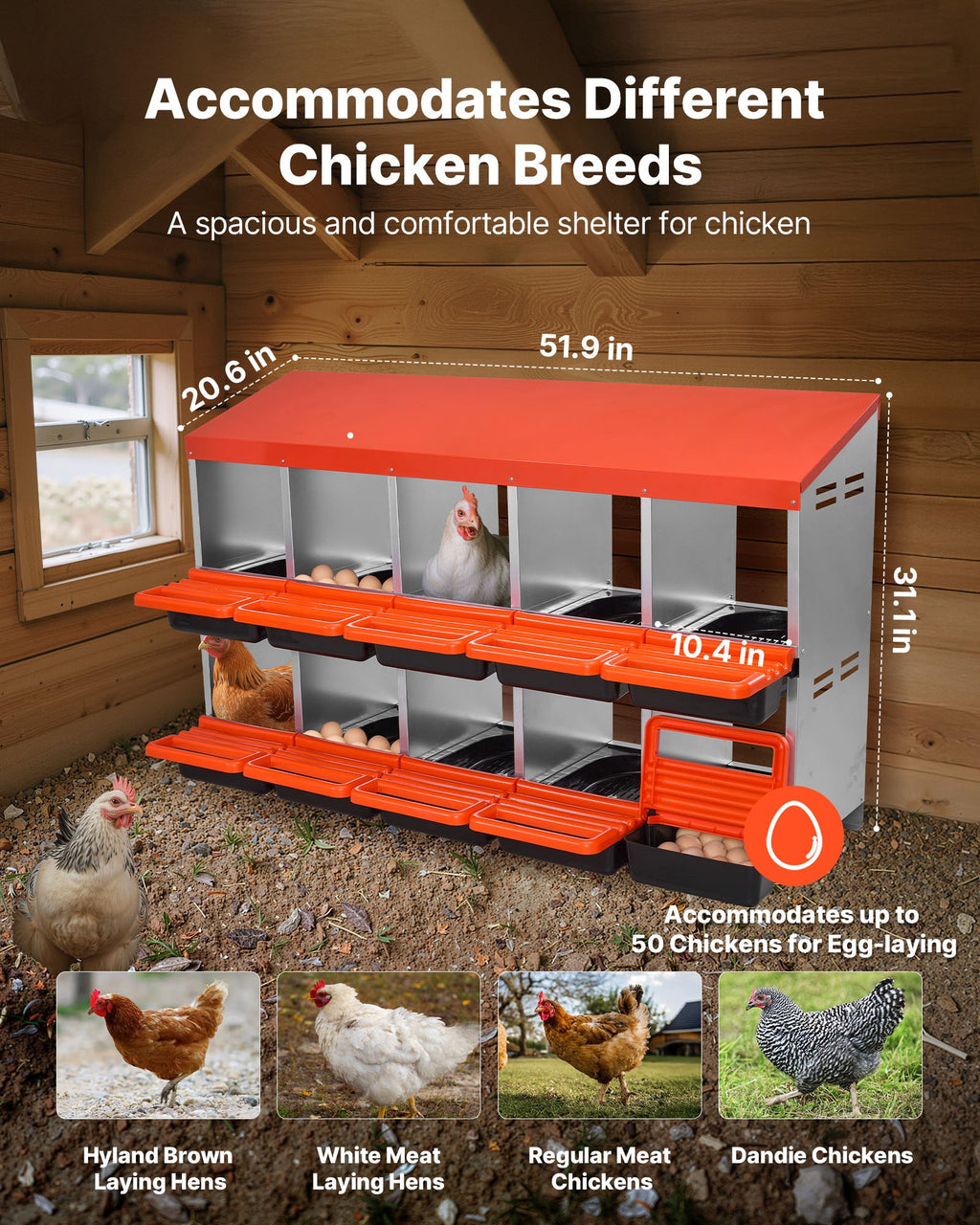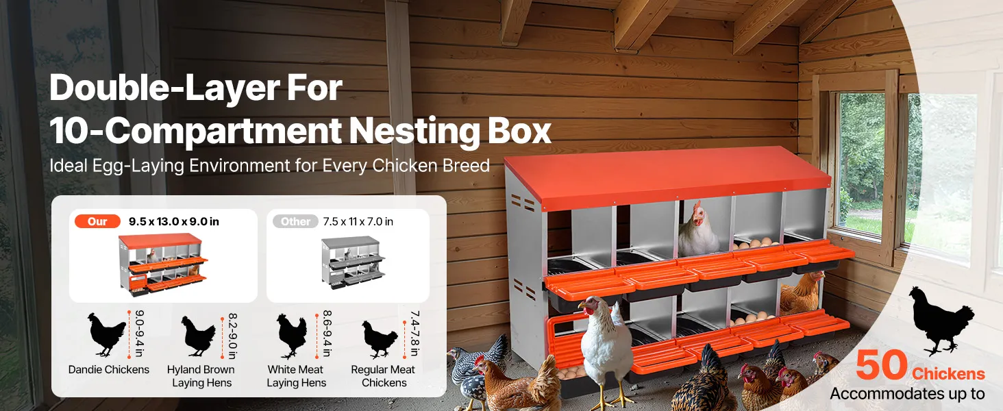 VEVOR 2 līmeņu dējējkastes ar 10 nodalījumiem, metāla olu dēšanas kaste ar aizsargpārsegiem un izslīdošo savākšanas sistēmu — viegli saliekama, piemērota vistām, pīlēm, cālīšiem un citiem mājputniem