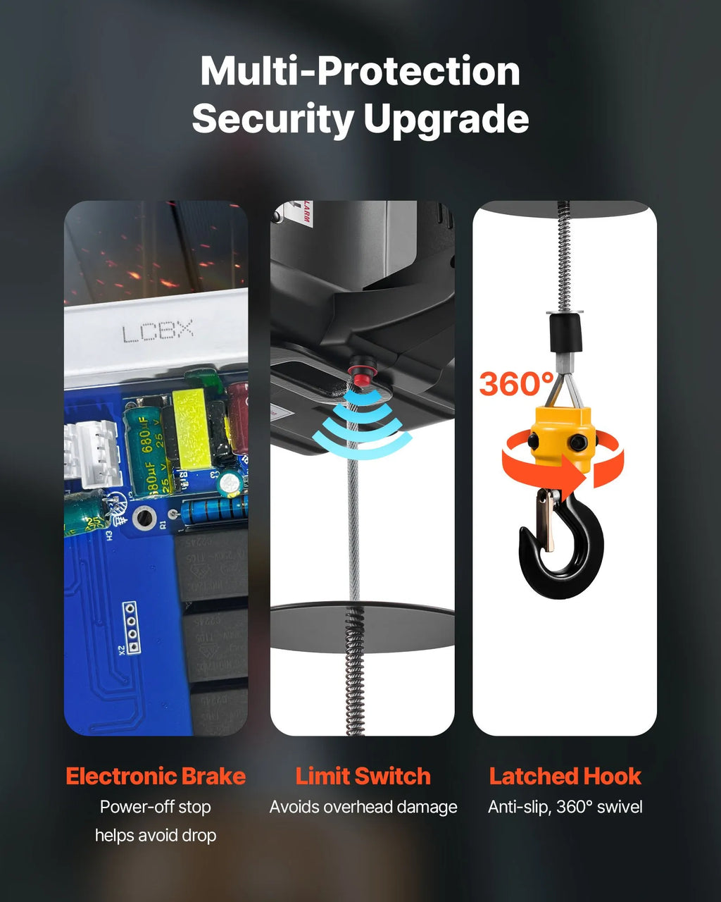 Daudzslāņu drošības aizsardzība: Elektriskais vinčas pacēlājs apvieno elektronisko un mehānisko bremzi drošai apstādināšanai. Ierobežošanas slēdzis un 360° bloķējošais āķis nodrošina papildu drošību, bet motors automātiski apstājas strāvas zuduma vai augšējā ierobežojuma gadījumā, novēršot kritienus.